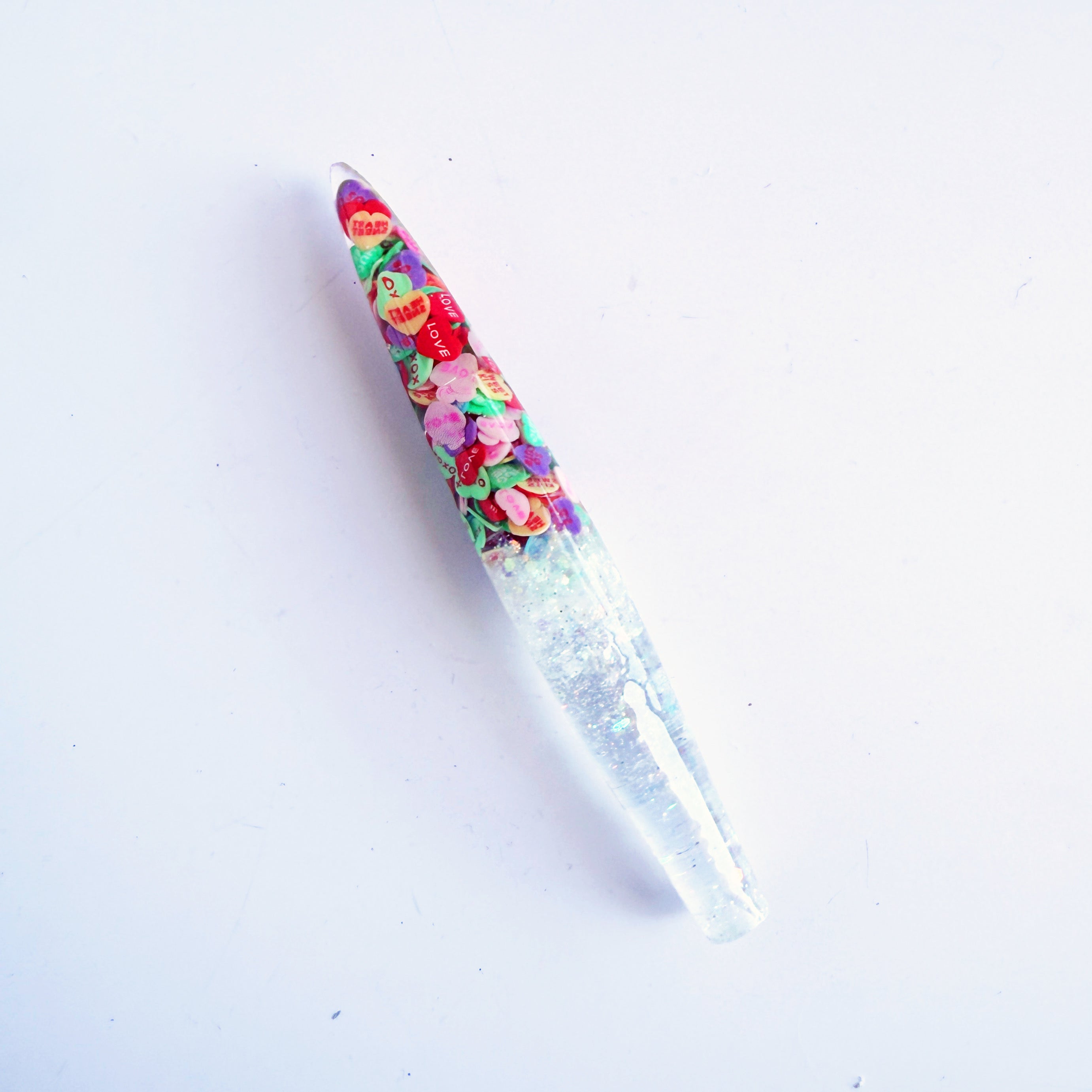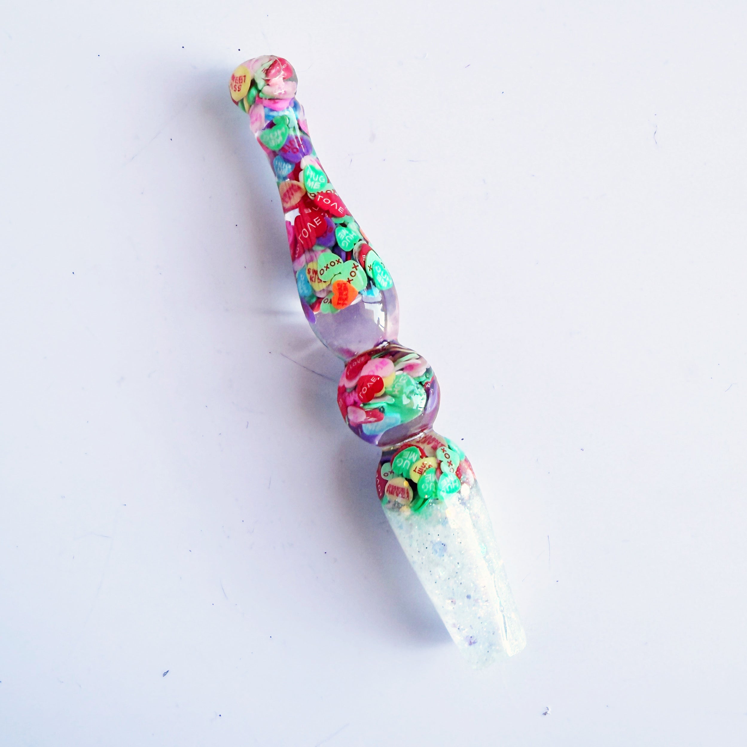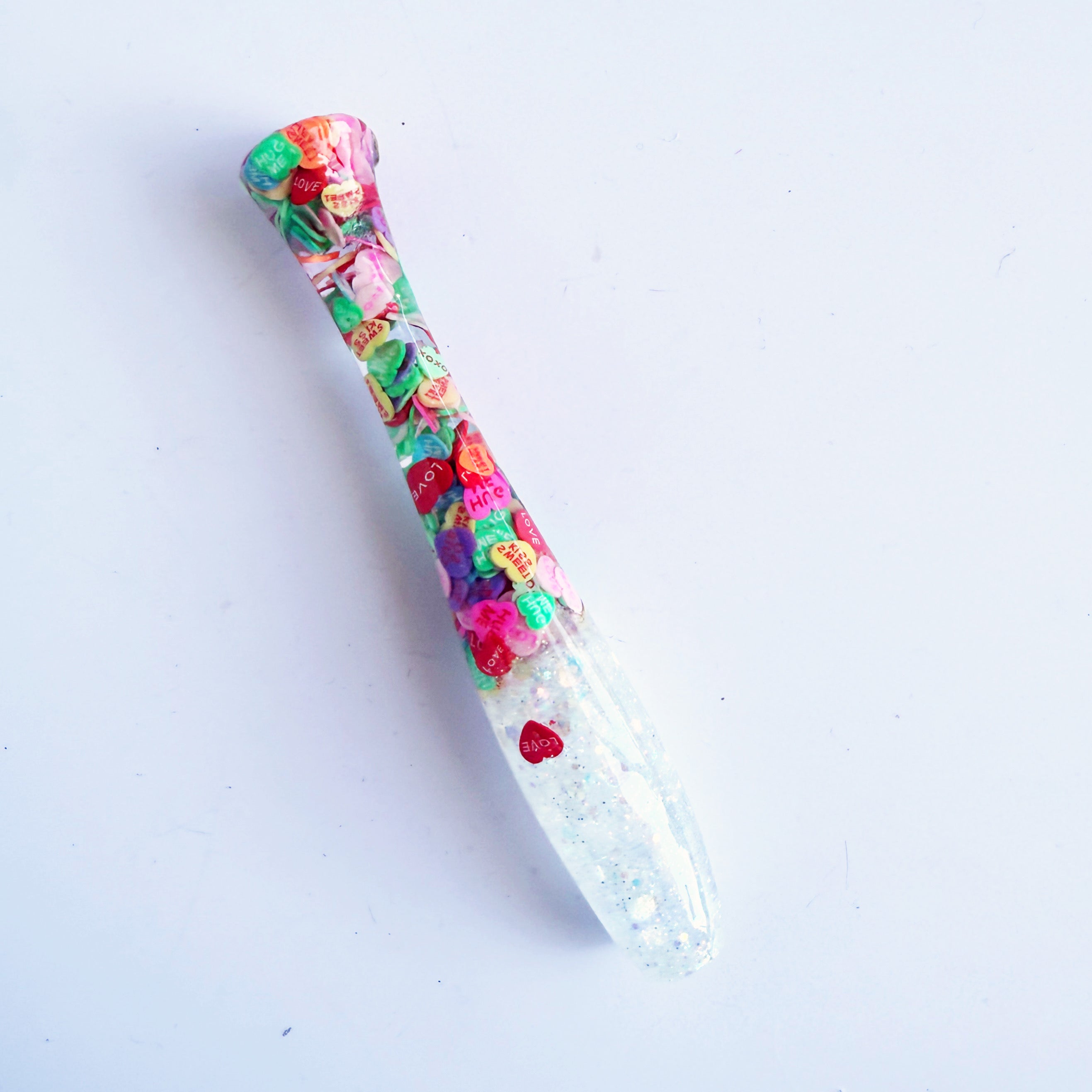 'Be Mine' Is a handle filled with rainbow clay candy hearts and an iridescent white chunky glitter.