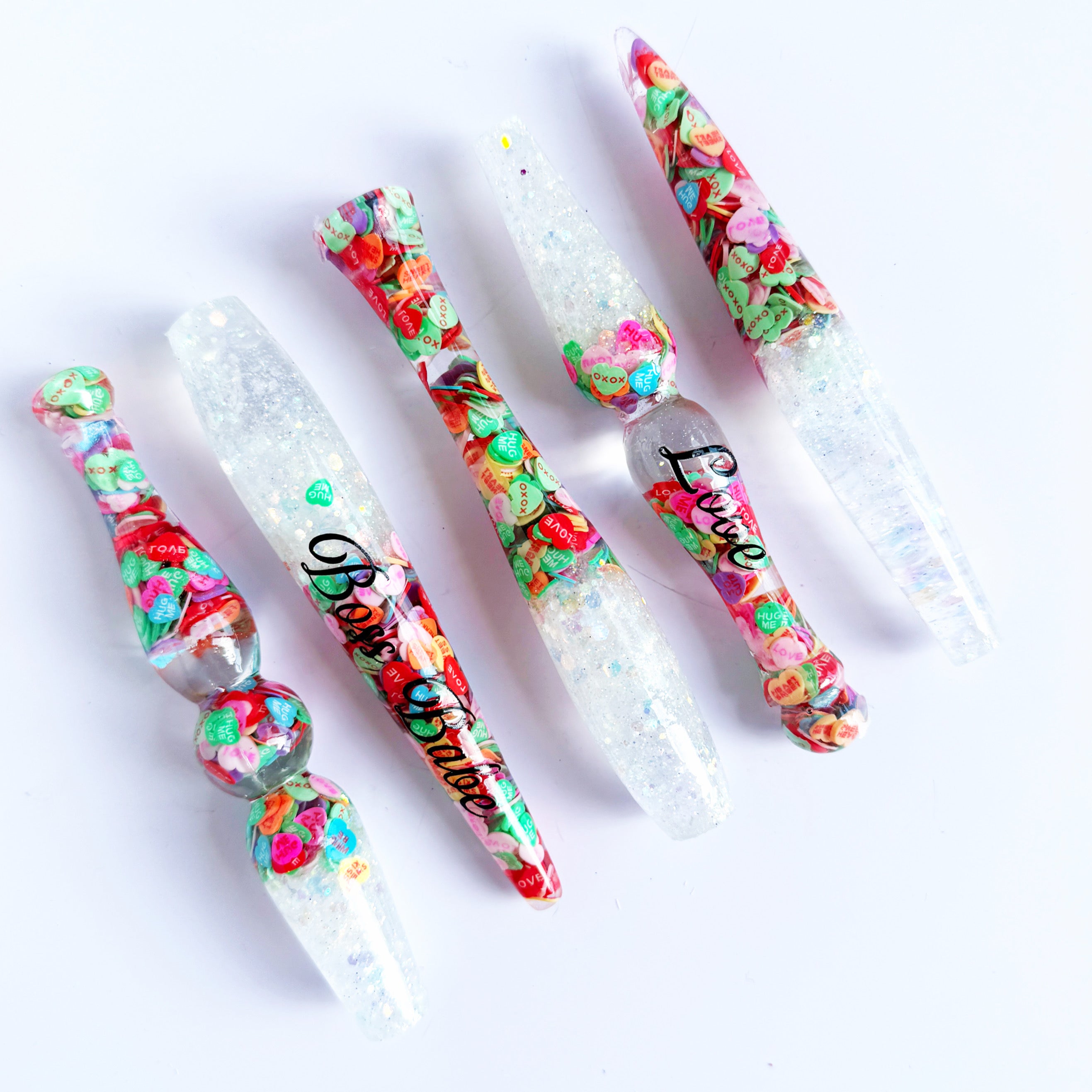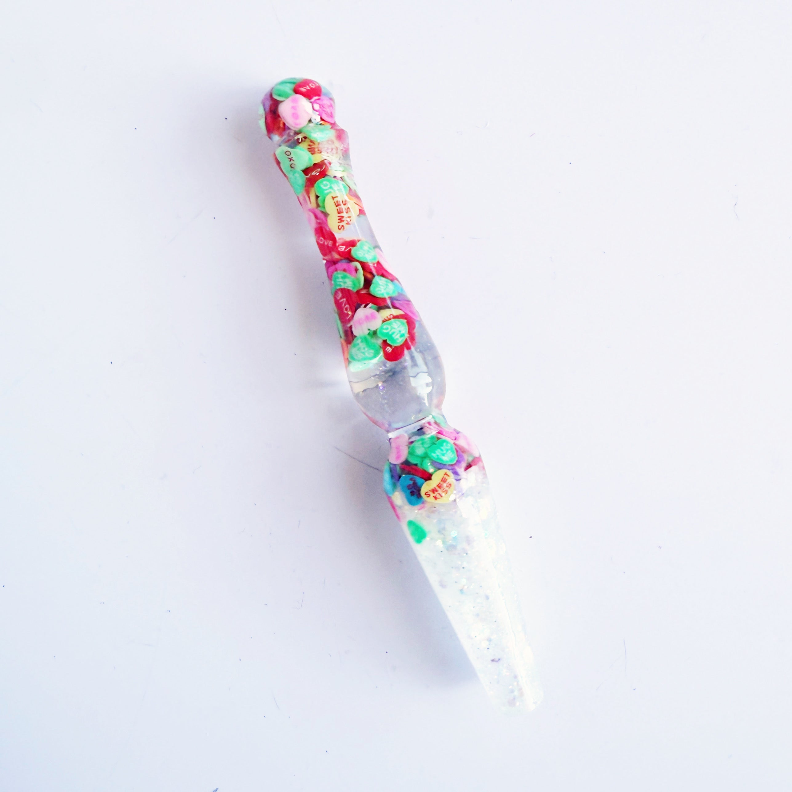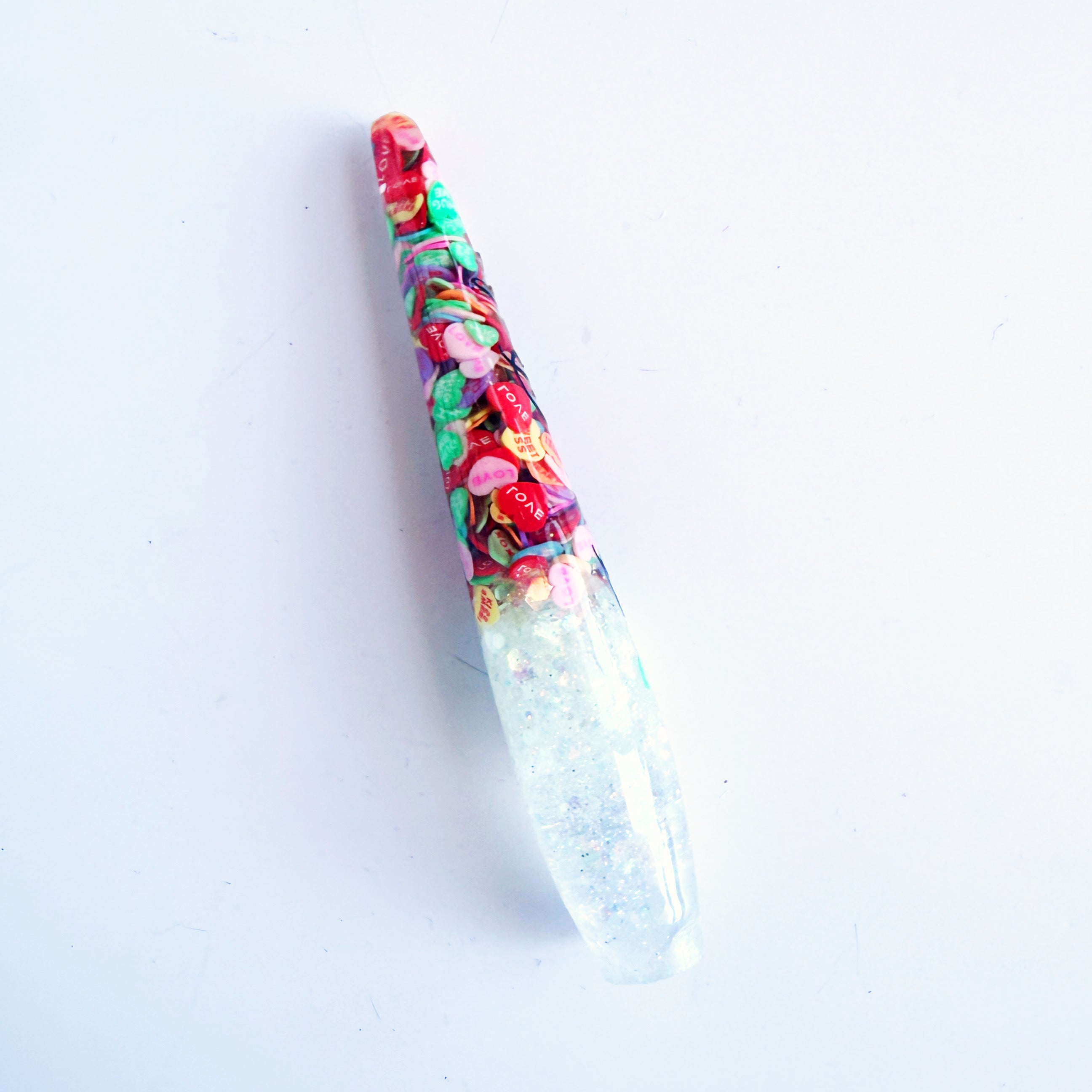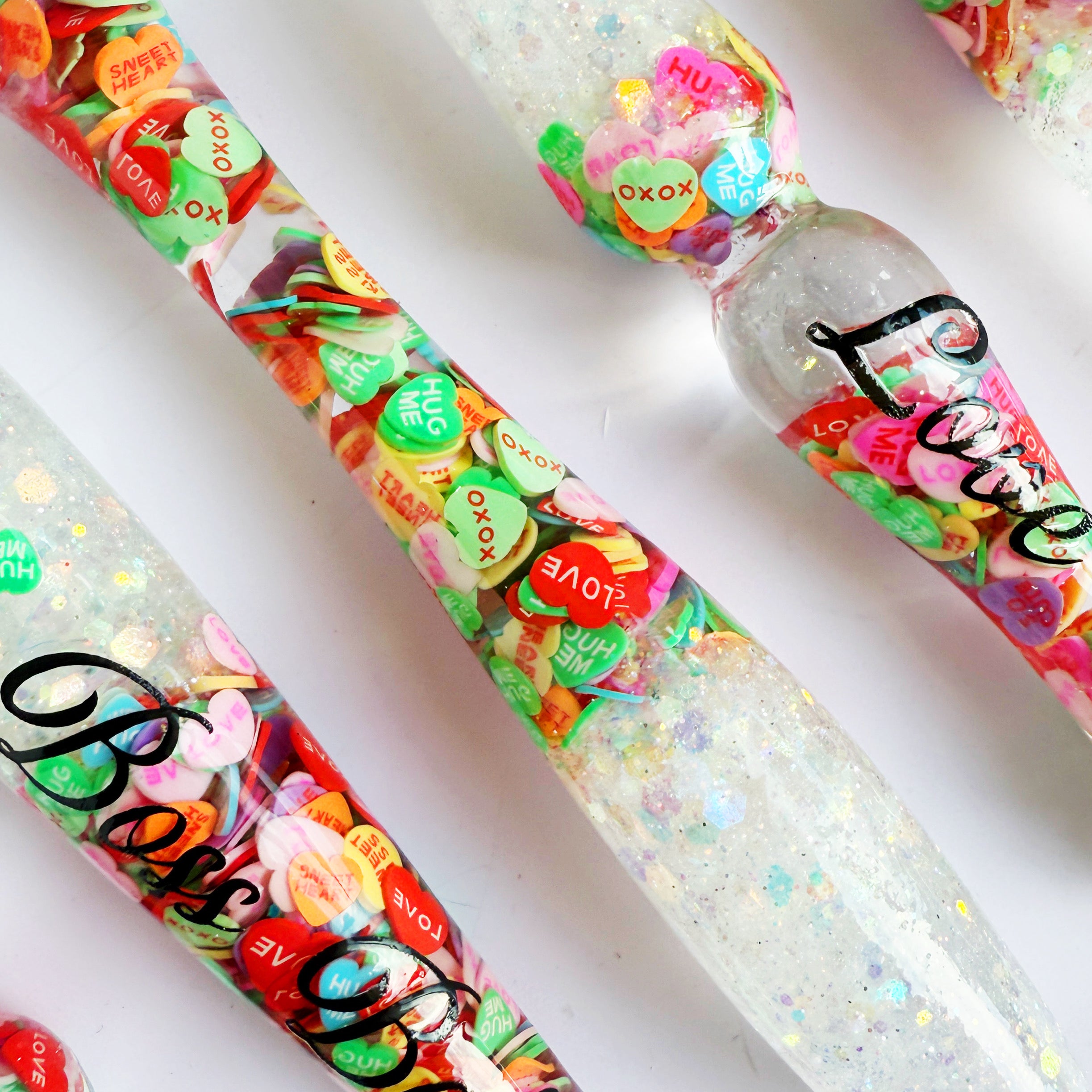 'Be Mine' Is a handle filled with rainbow clay candy hearts and an iridescent white chunky glitter.