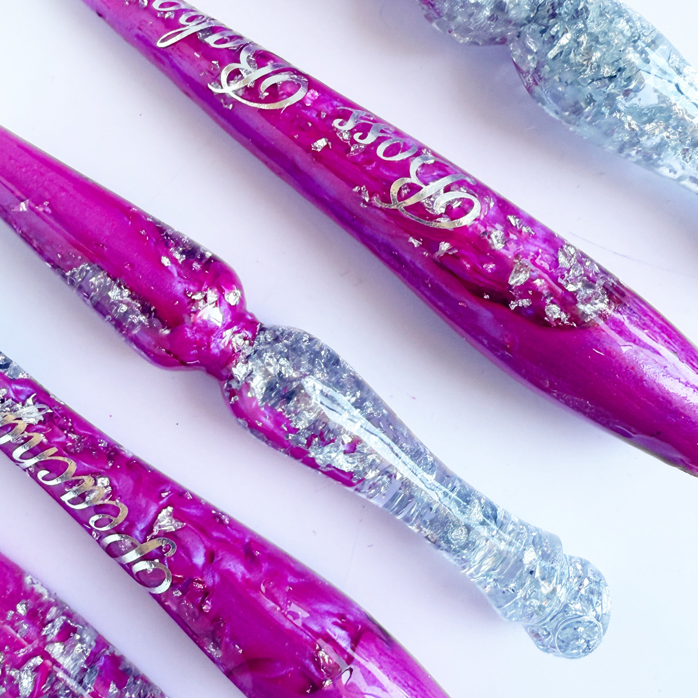 This listing is for 1 completed Ergonomic Crochet hook with a resin handle. Handles are pre-made and are completed when you order with your choice of hook tip, hook size measurement inlay and finished with a super shiny clear coat of epoxy.