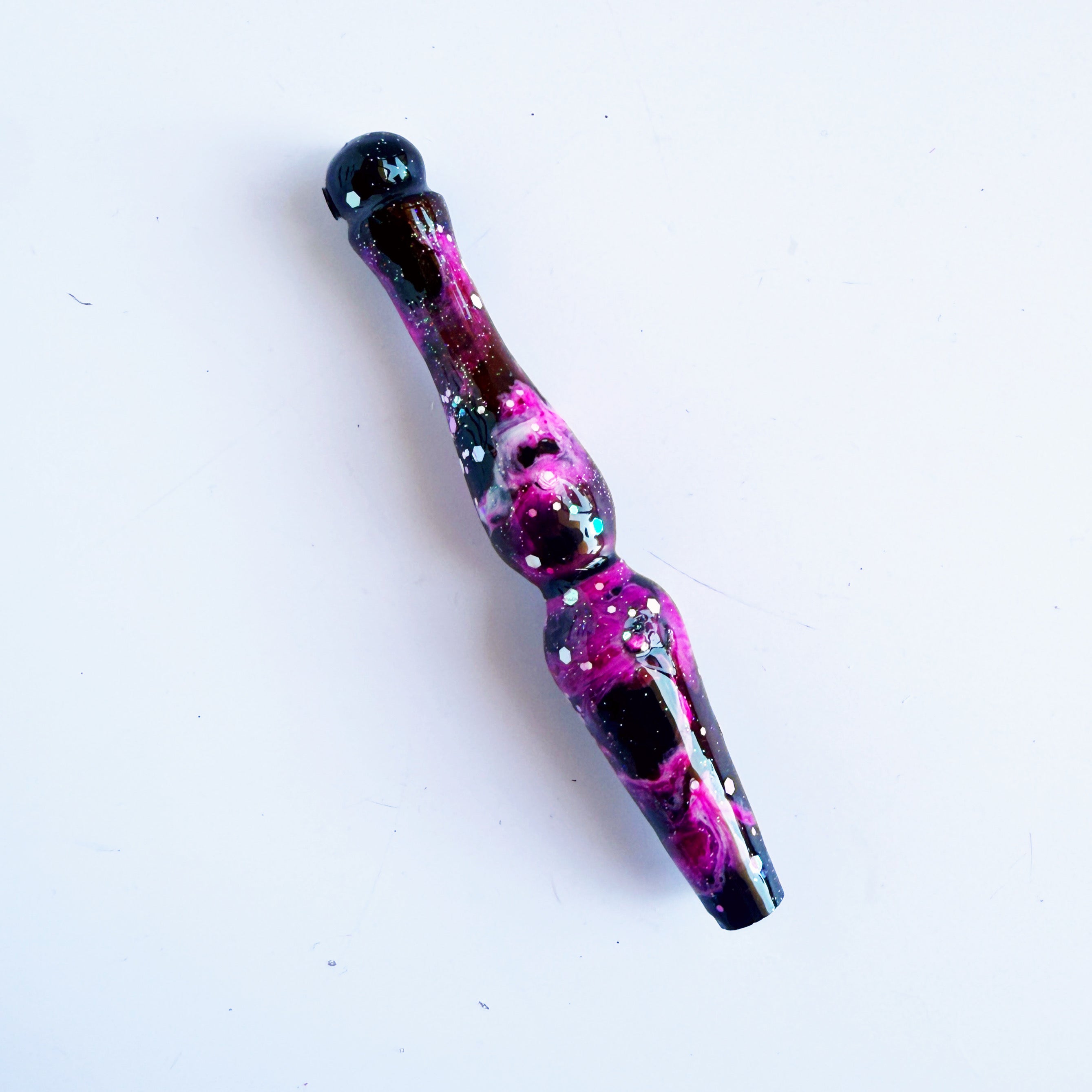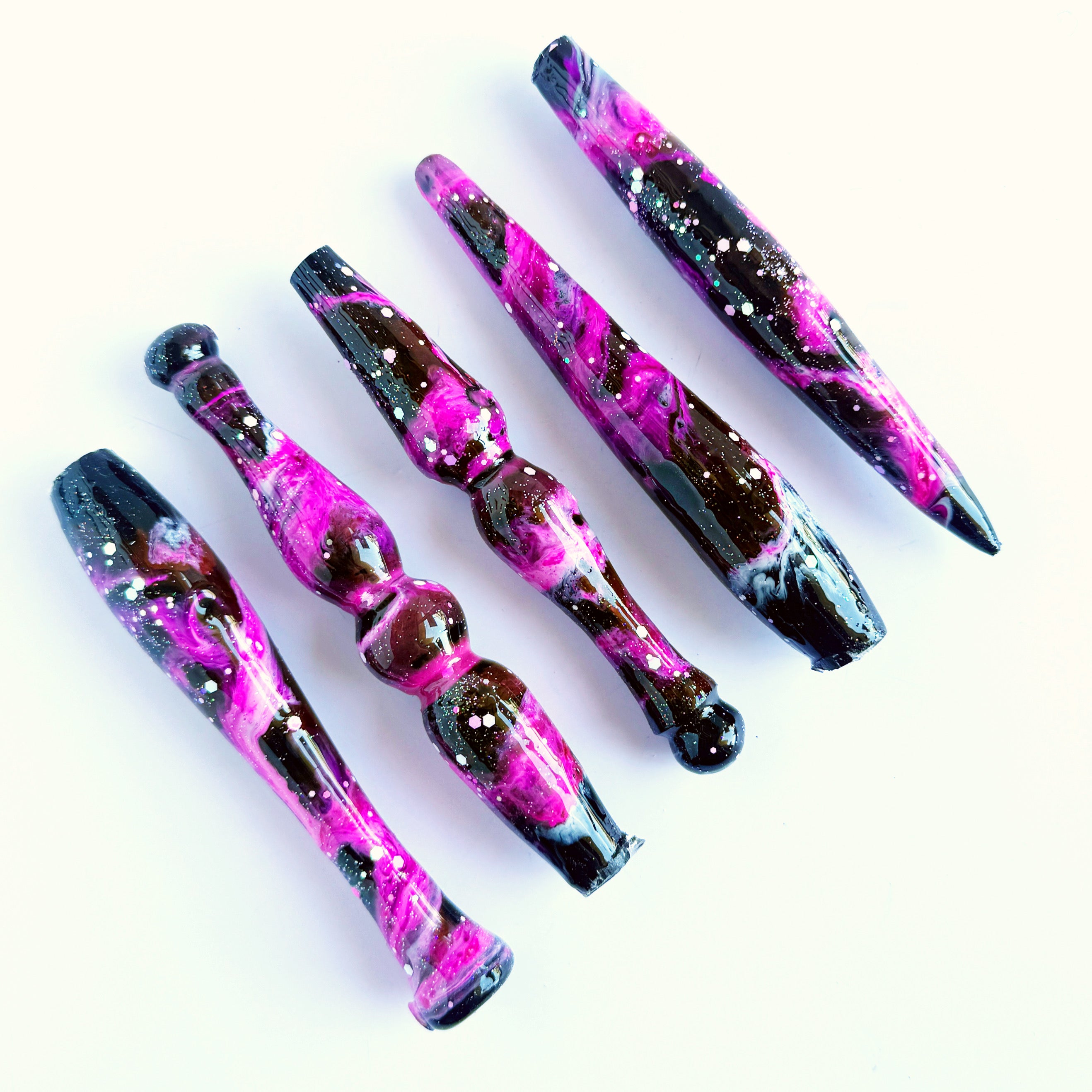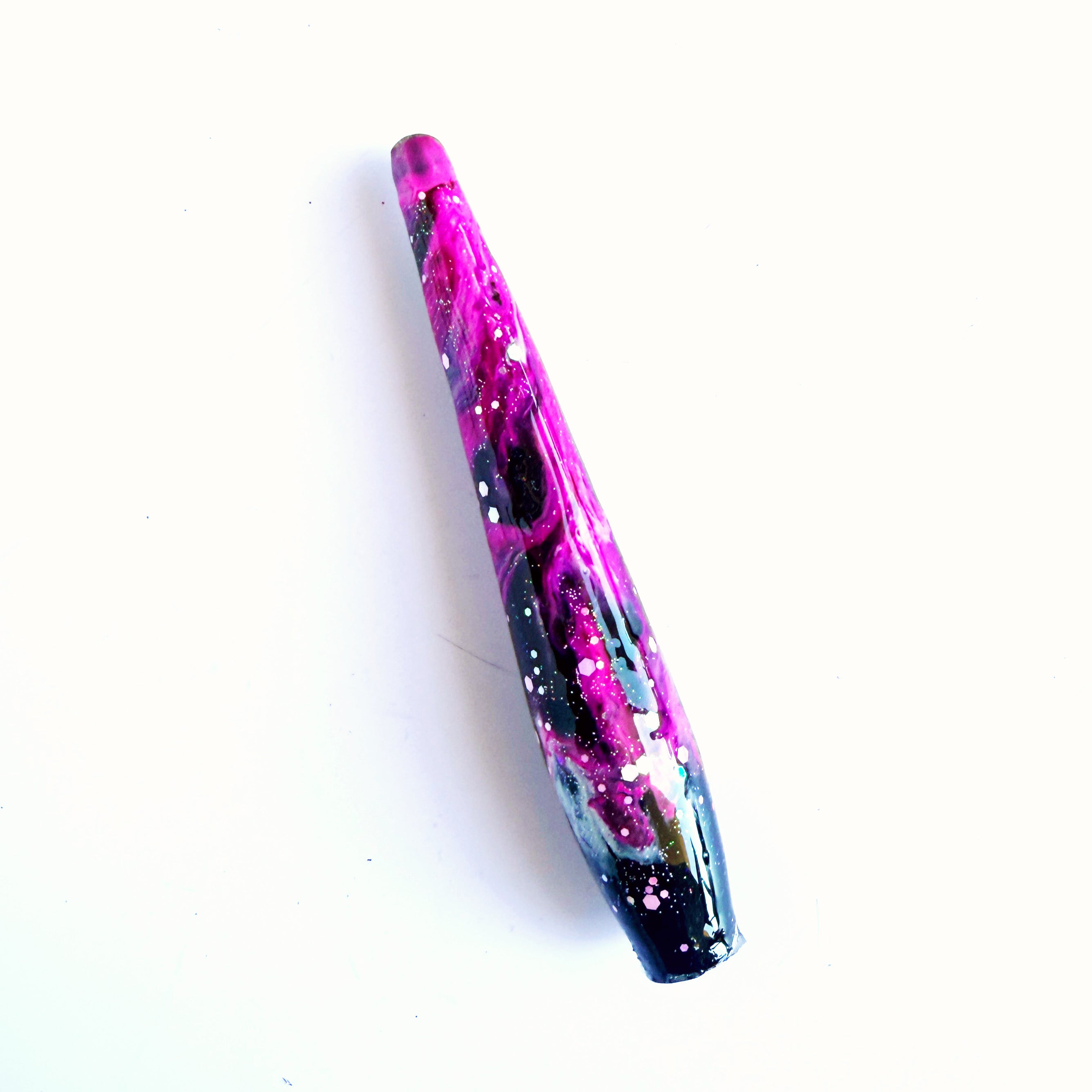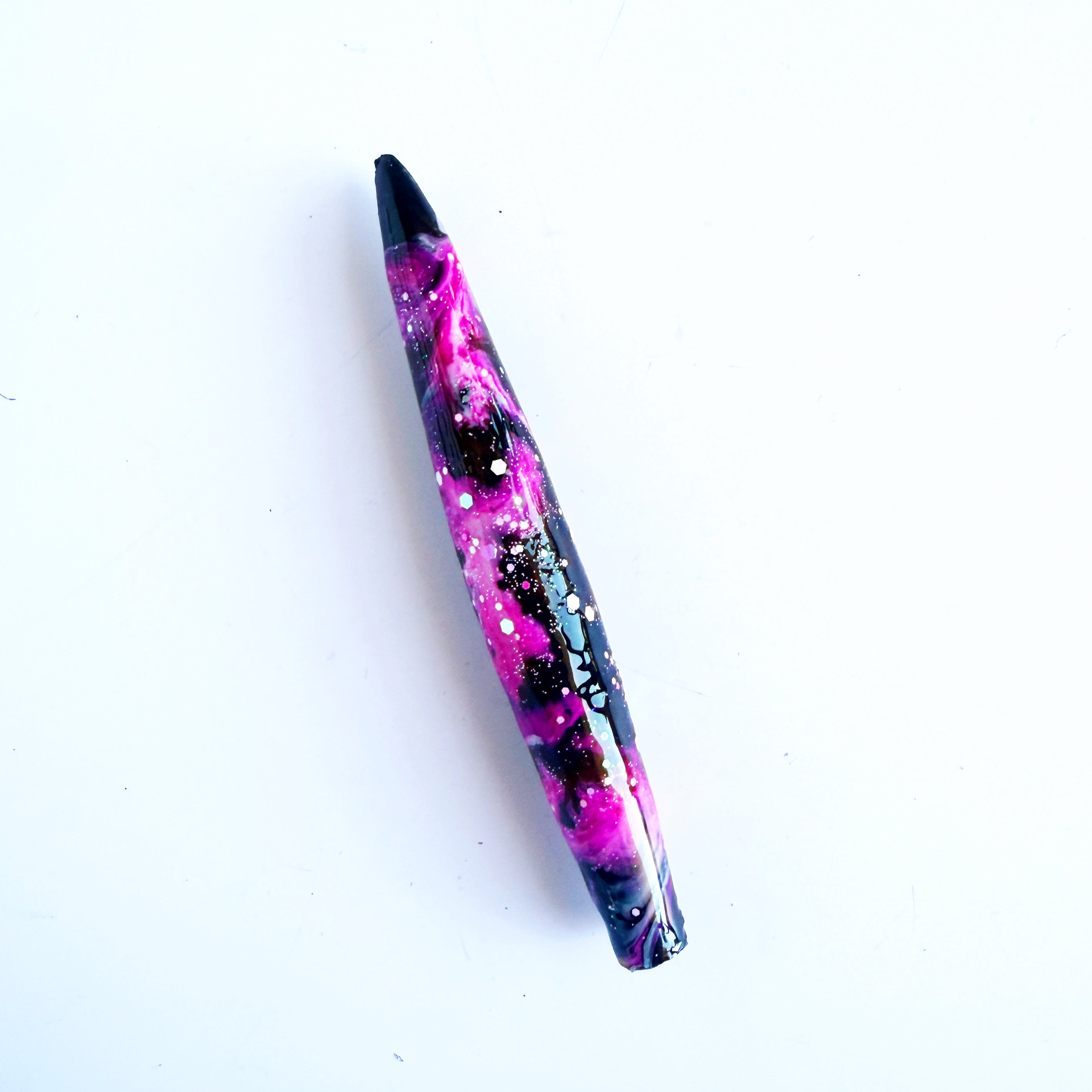 'The Fault In Our Stars' Is a stunning, etherial colourway. a solid black base with inky pink and white galaxies with a sprinkle of pink glitter.
