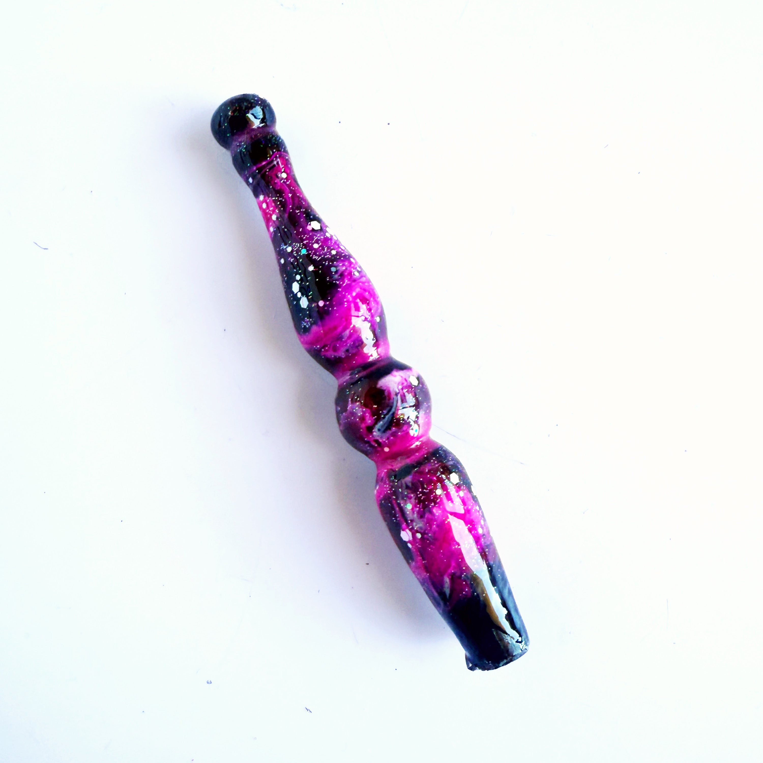 This listing is for 1 completed Ergonomic Crochet hook with a resin handle. Handles are pre-made and are completed when you order with your choice of hook tip, hook size measurement inlay and finished with a super shiny clear coat of epoxy.