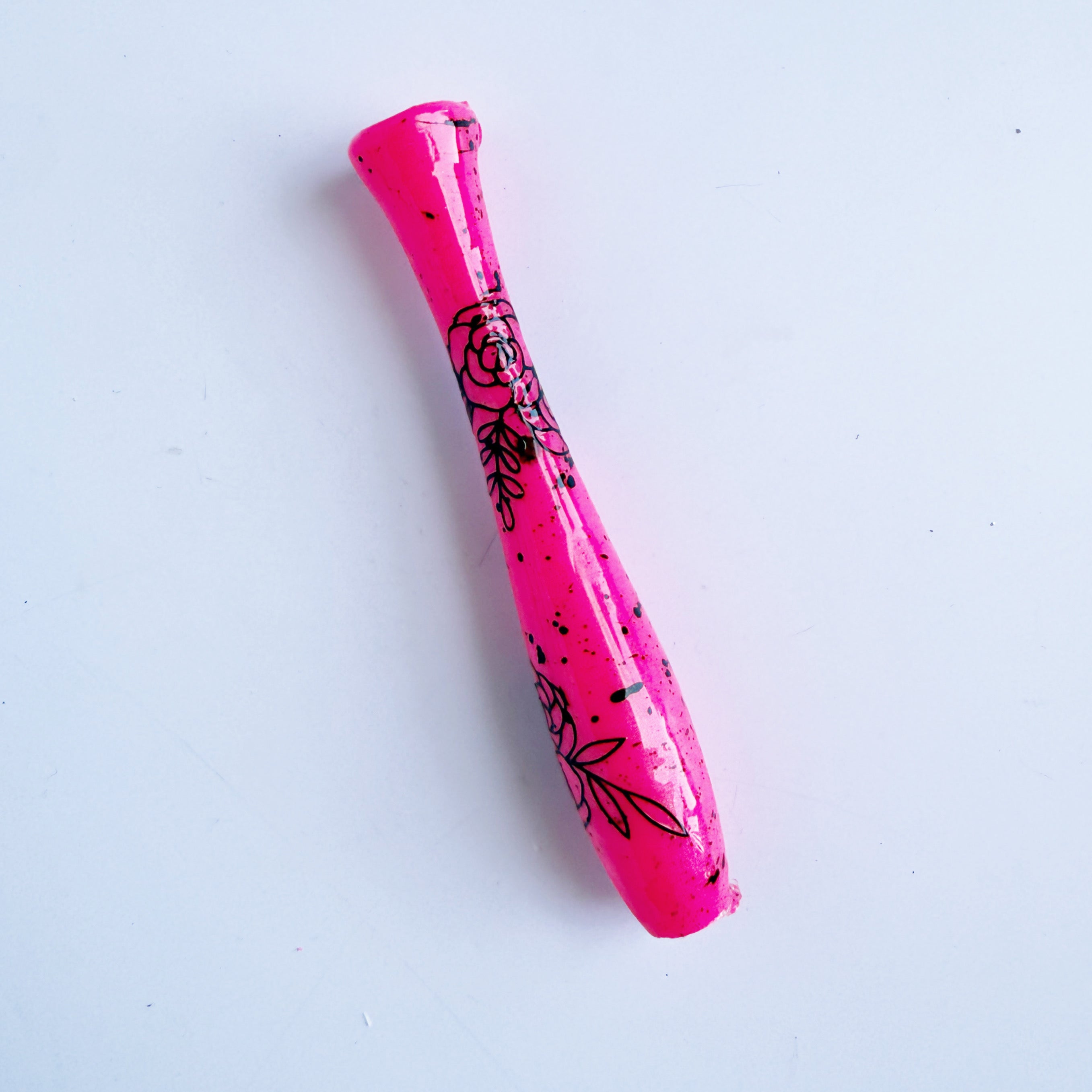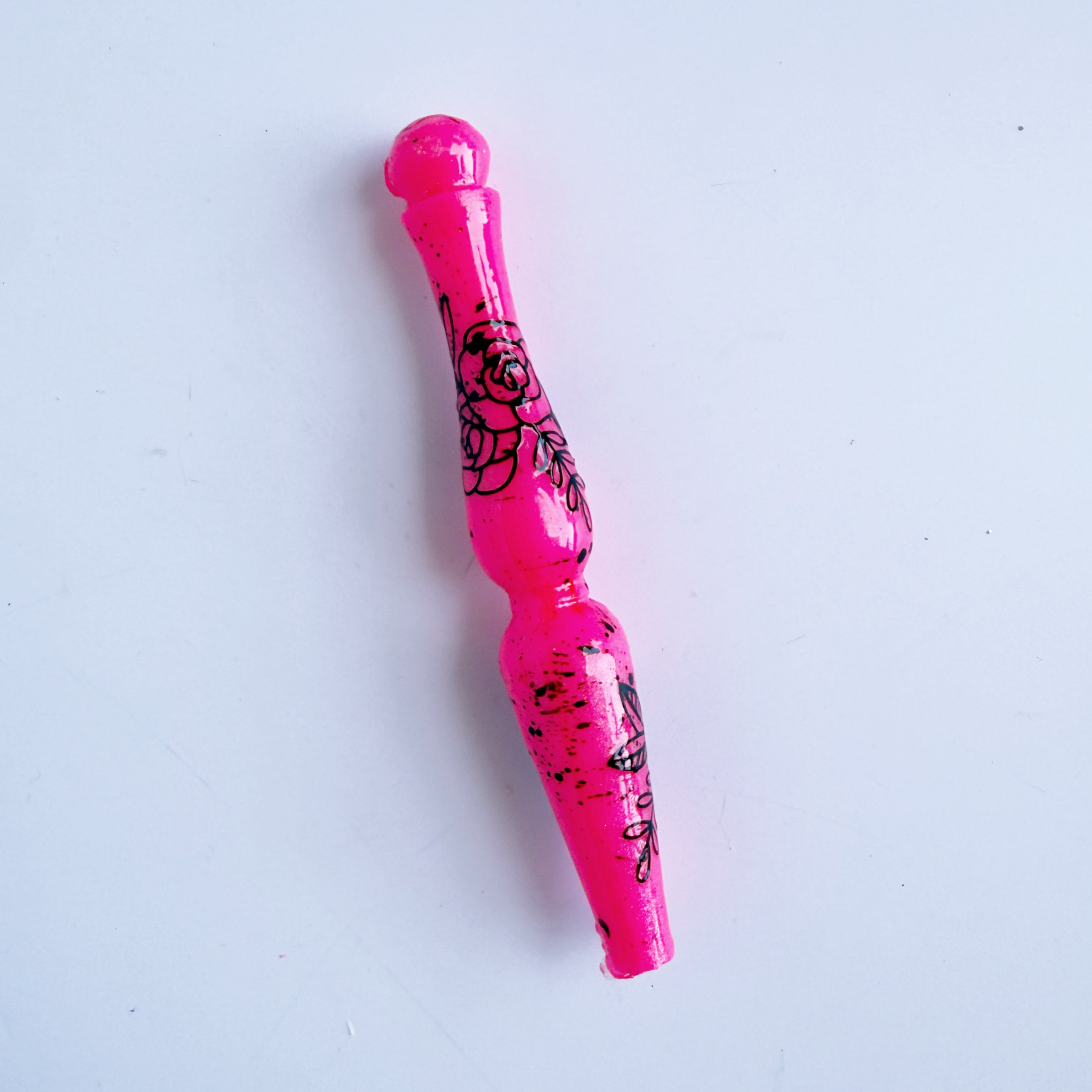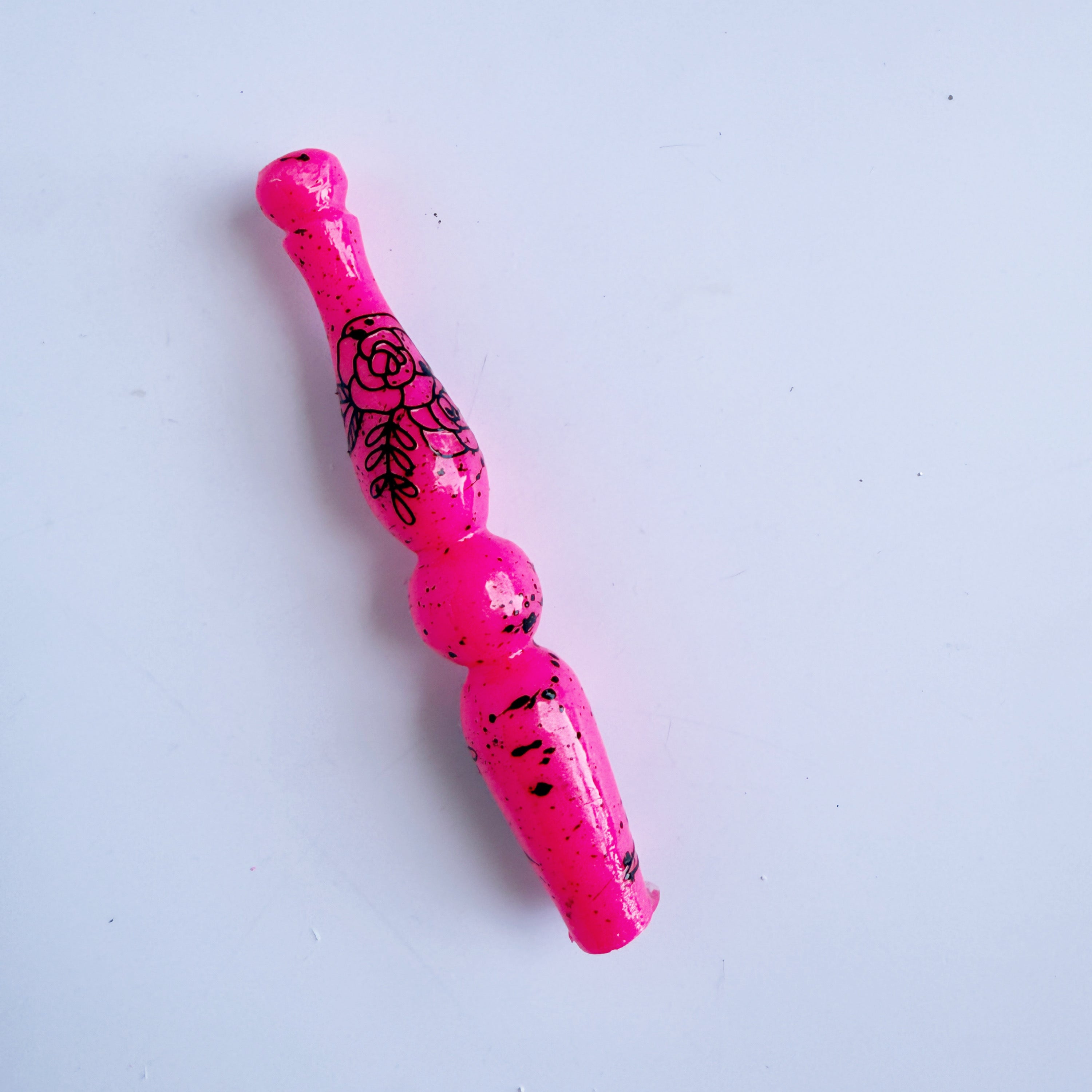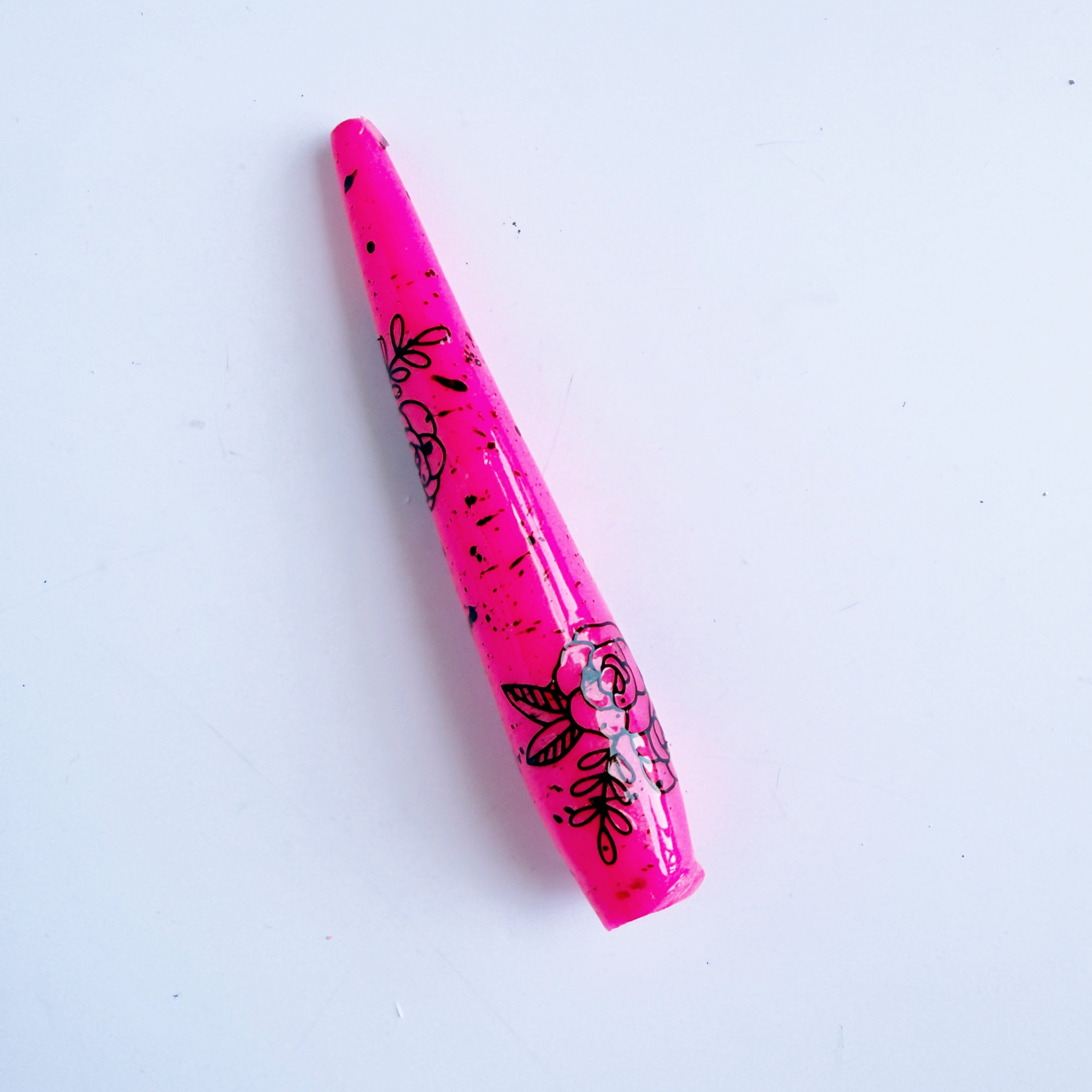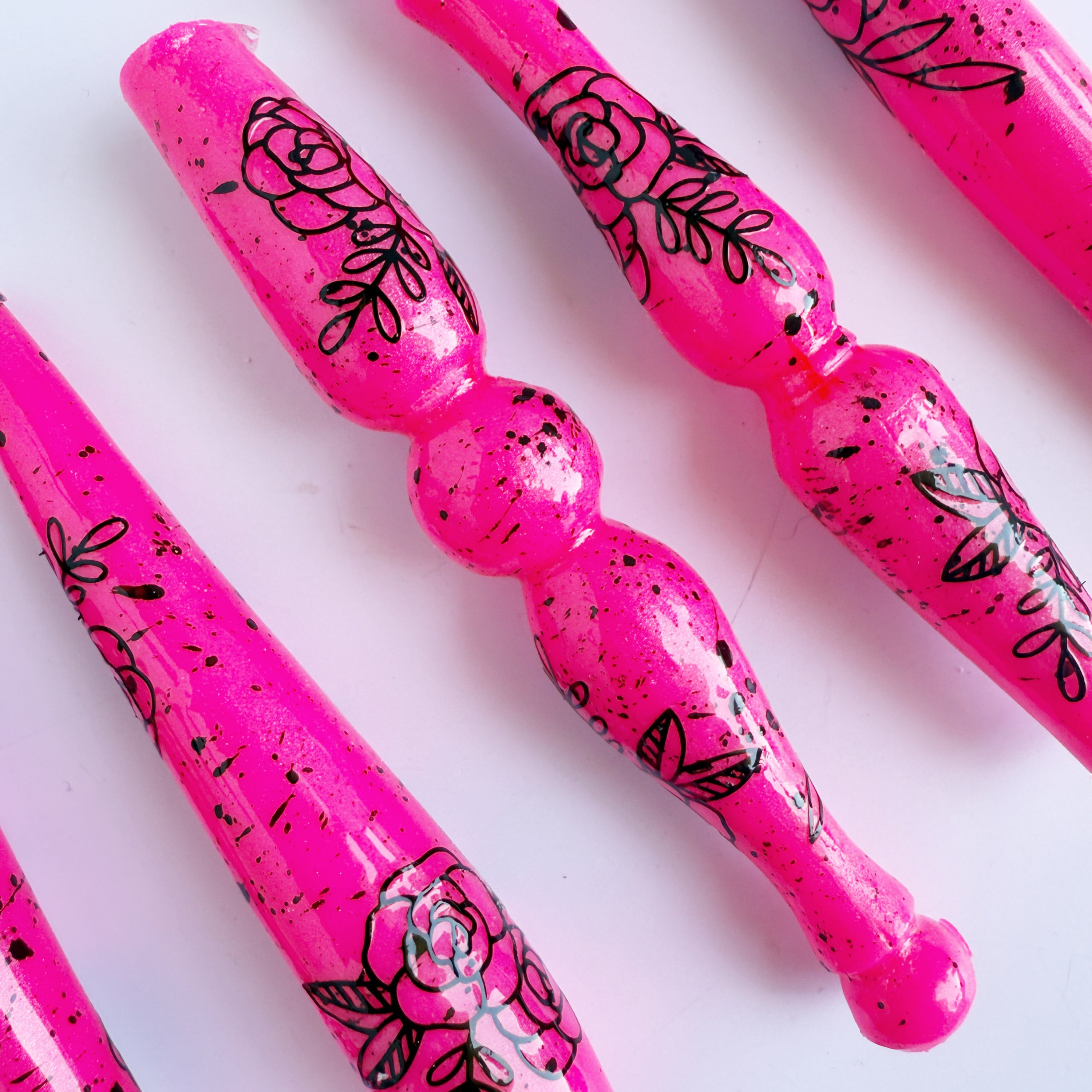 'Anarchy' is a shimmery neon pink base (glows under black light!) with black flower decals and black paint splatter effect.