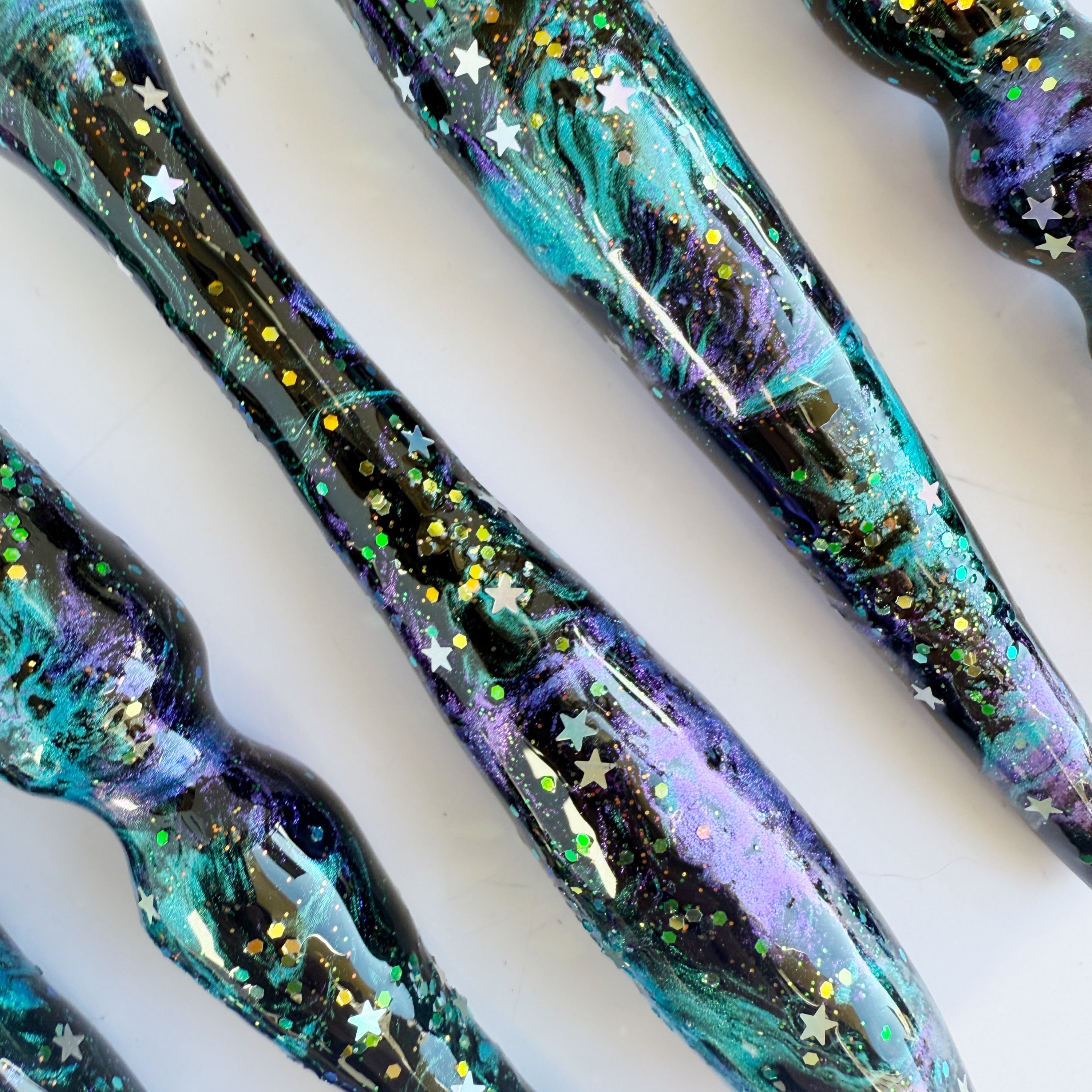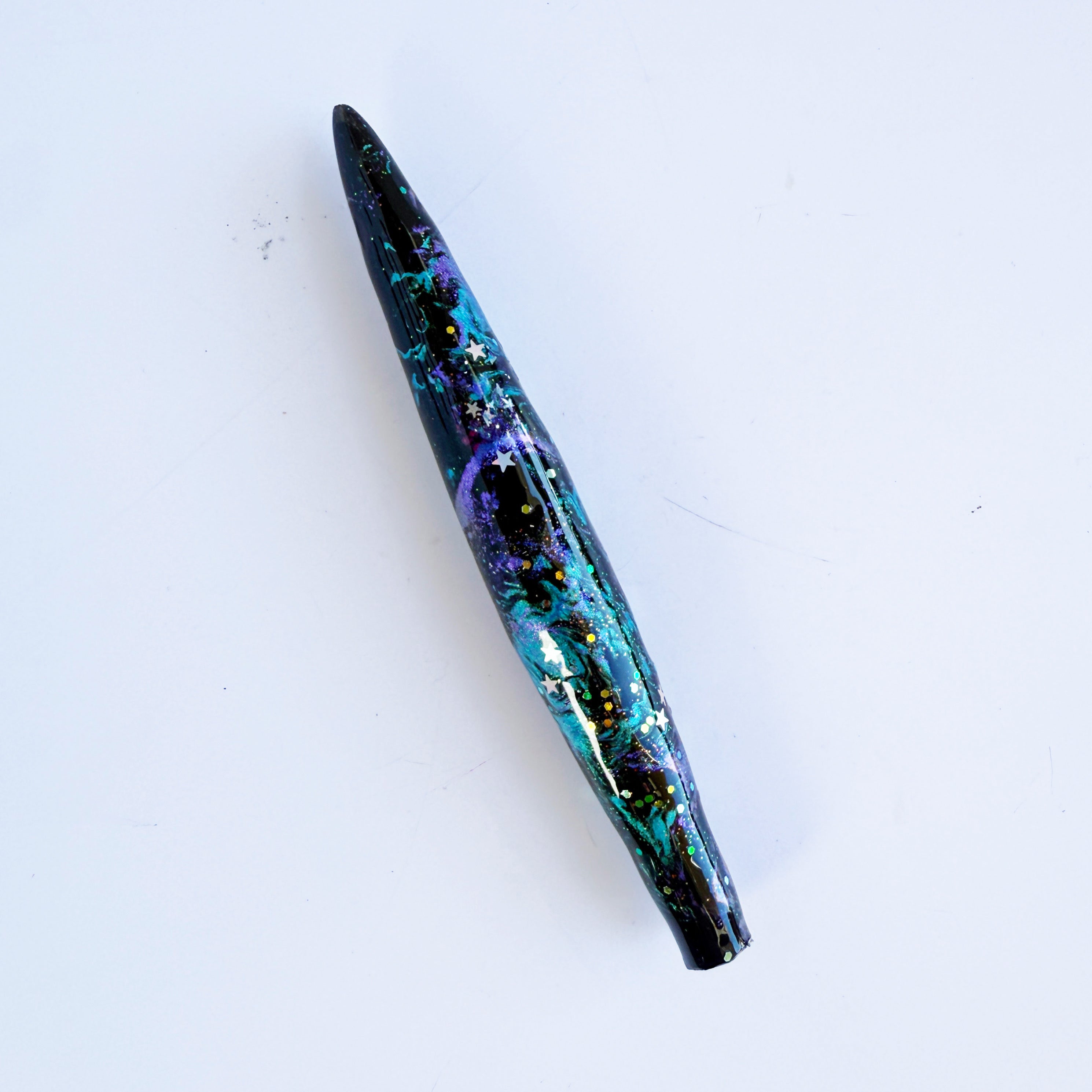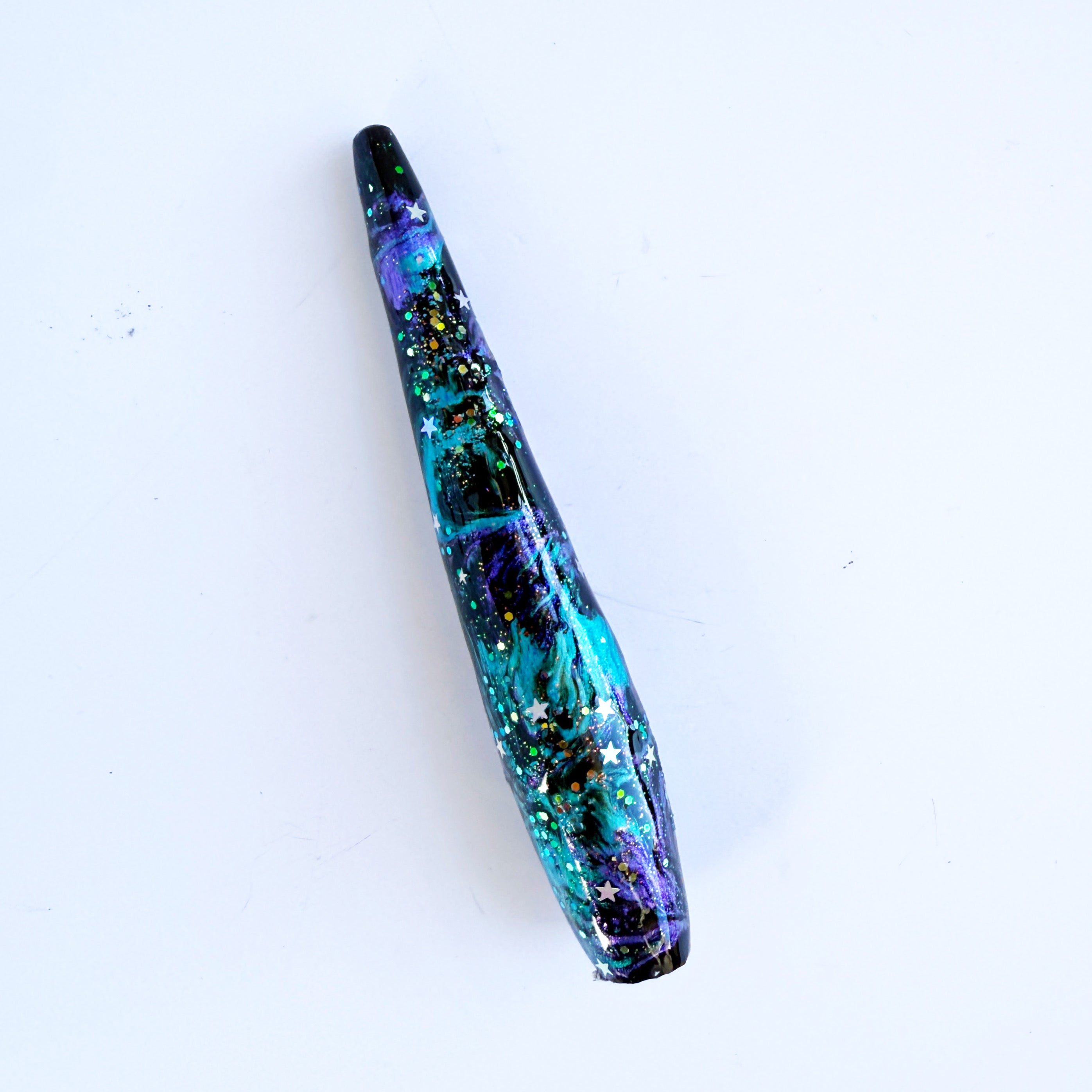 "Artemis" is a galaxy themed handle with teal and purple shimmers and silver star glitter.
