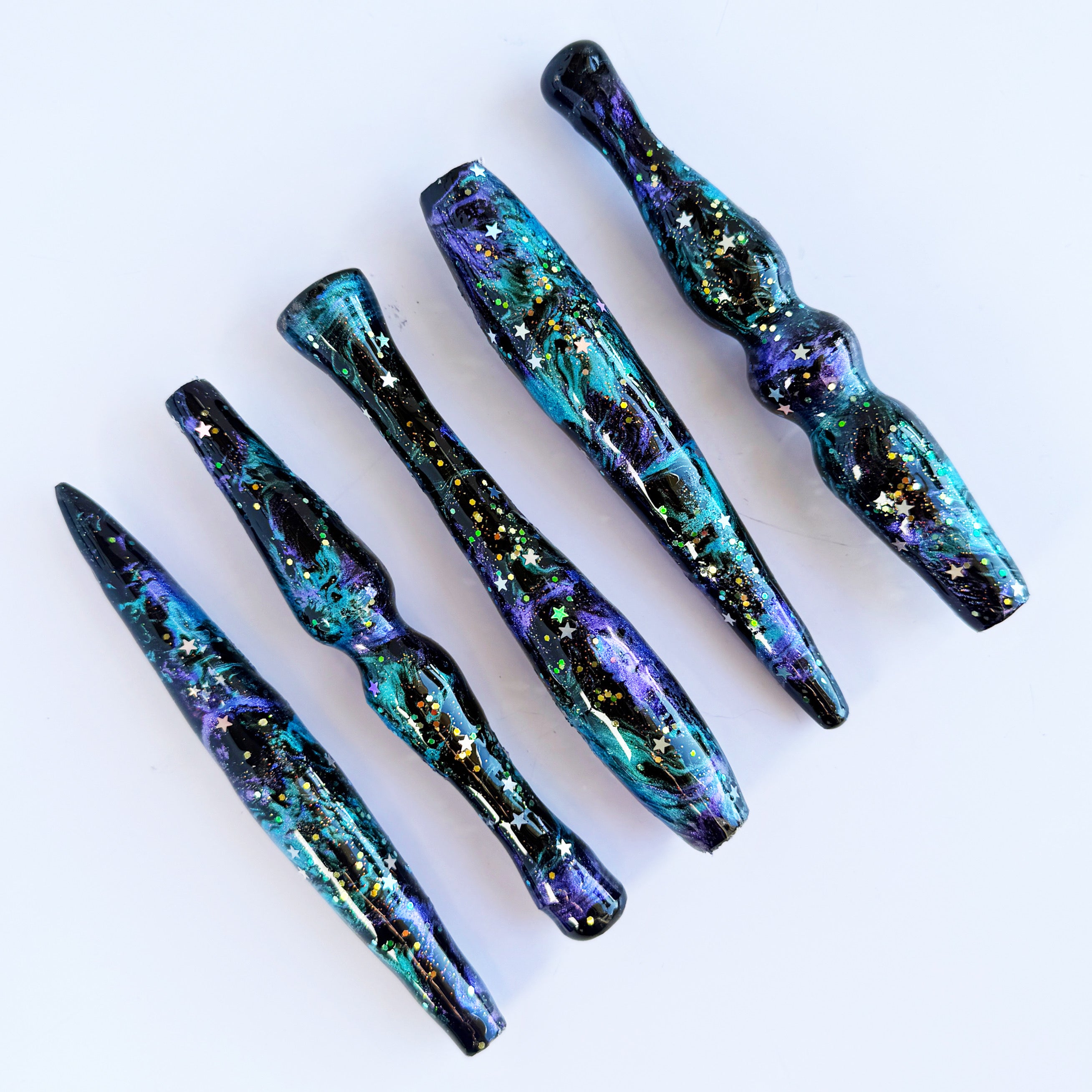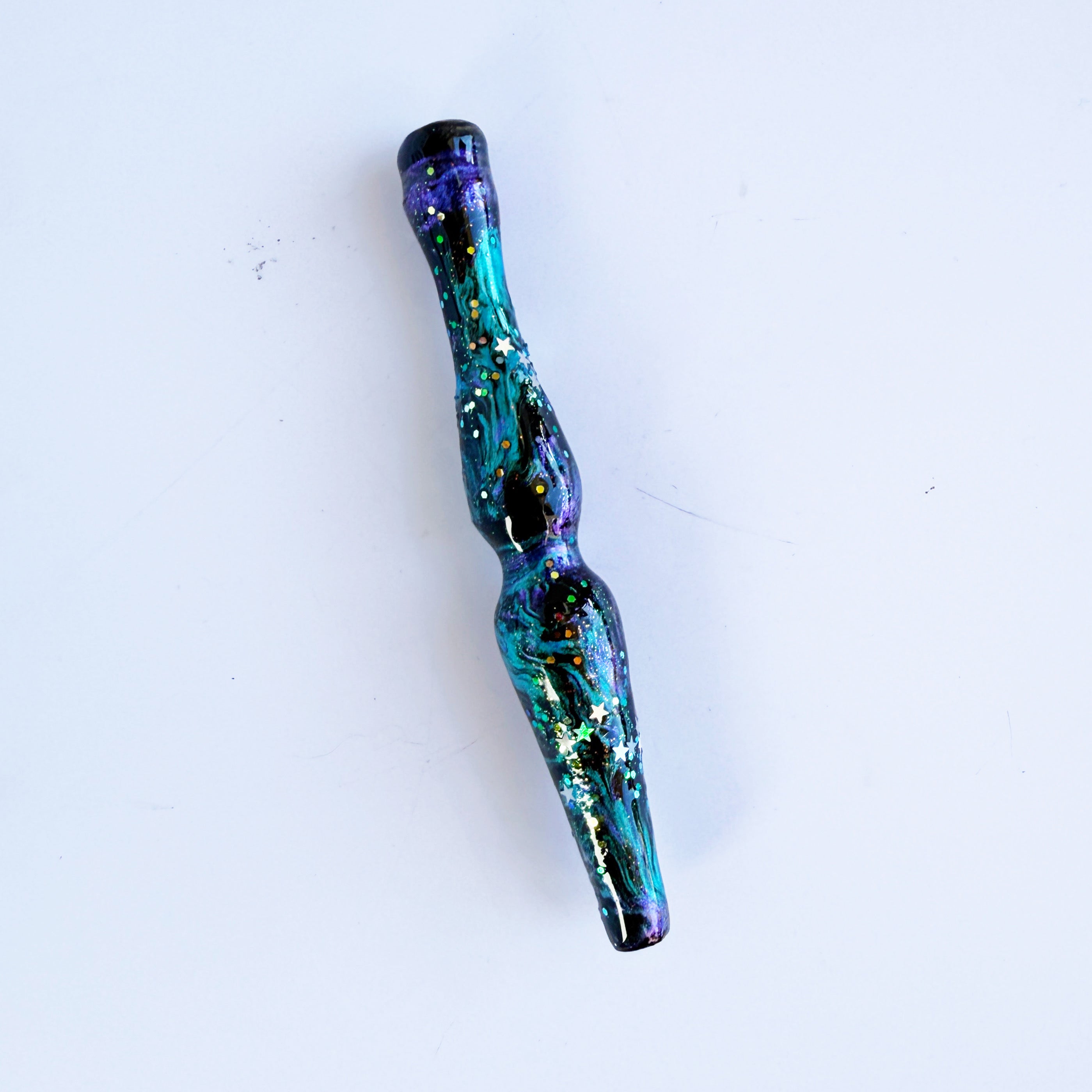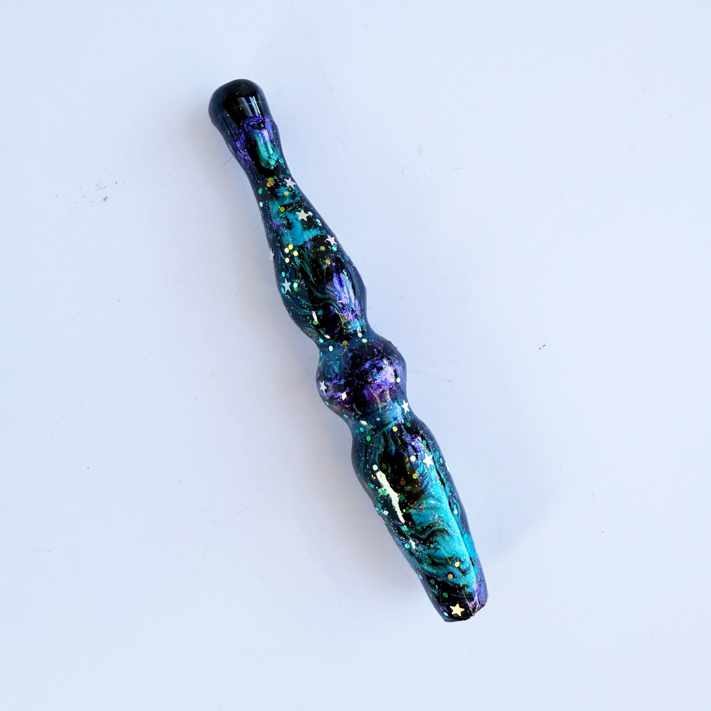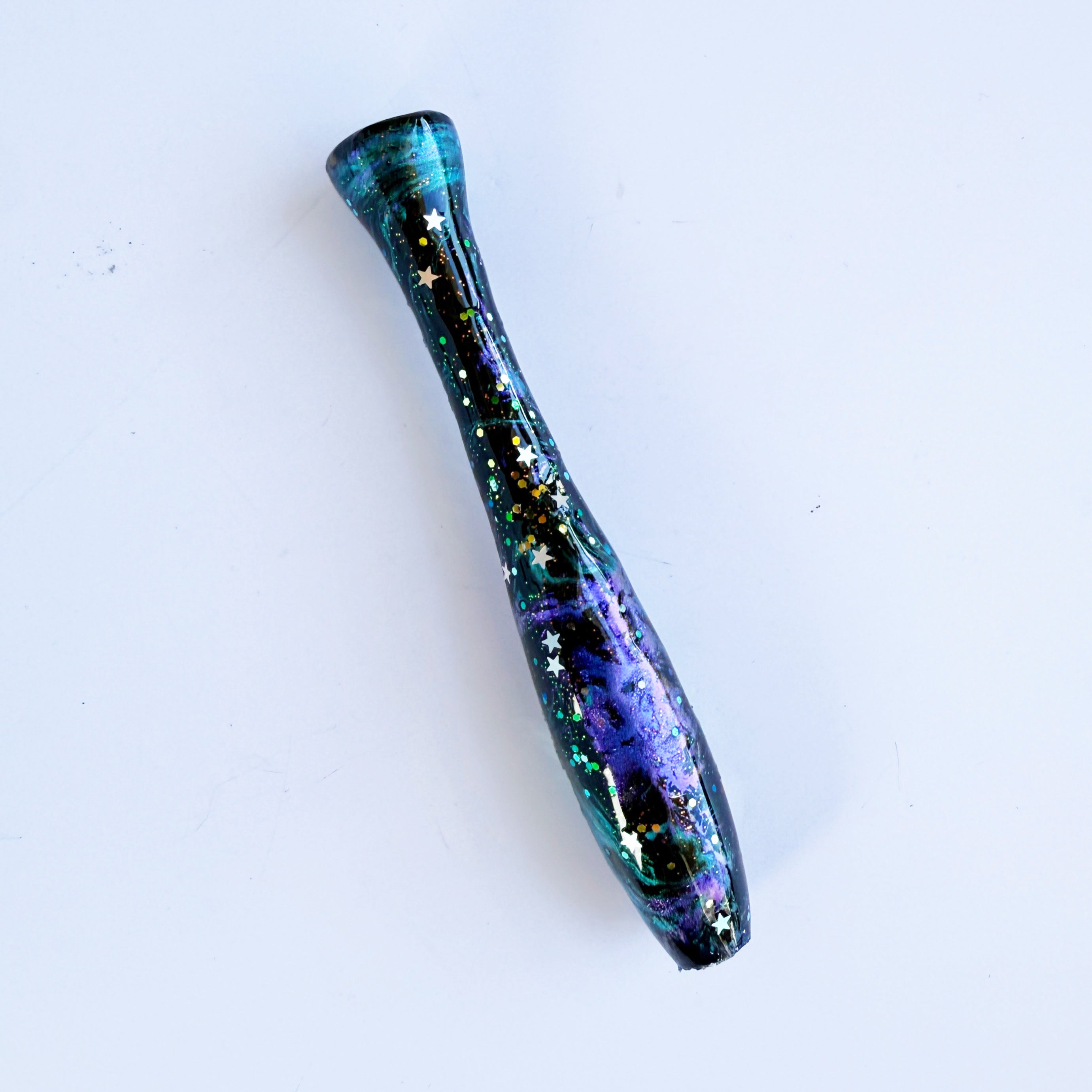 "Artemis" is a galaxy themed handle with teal and purple shimmers and silver star glitter.