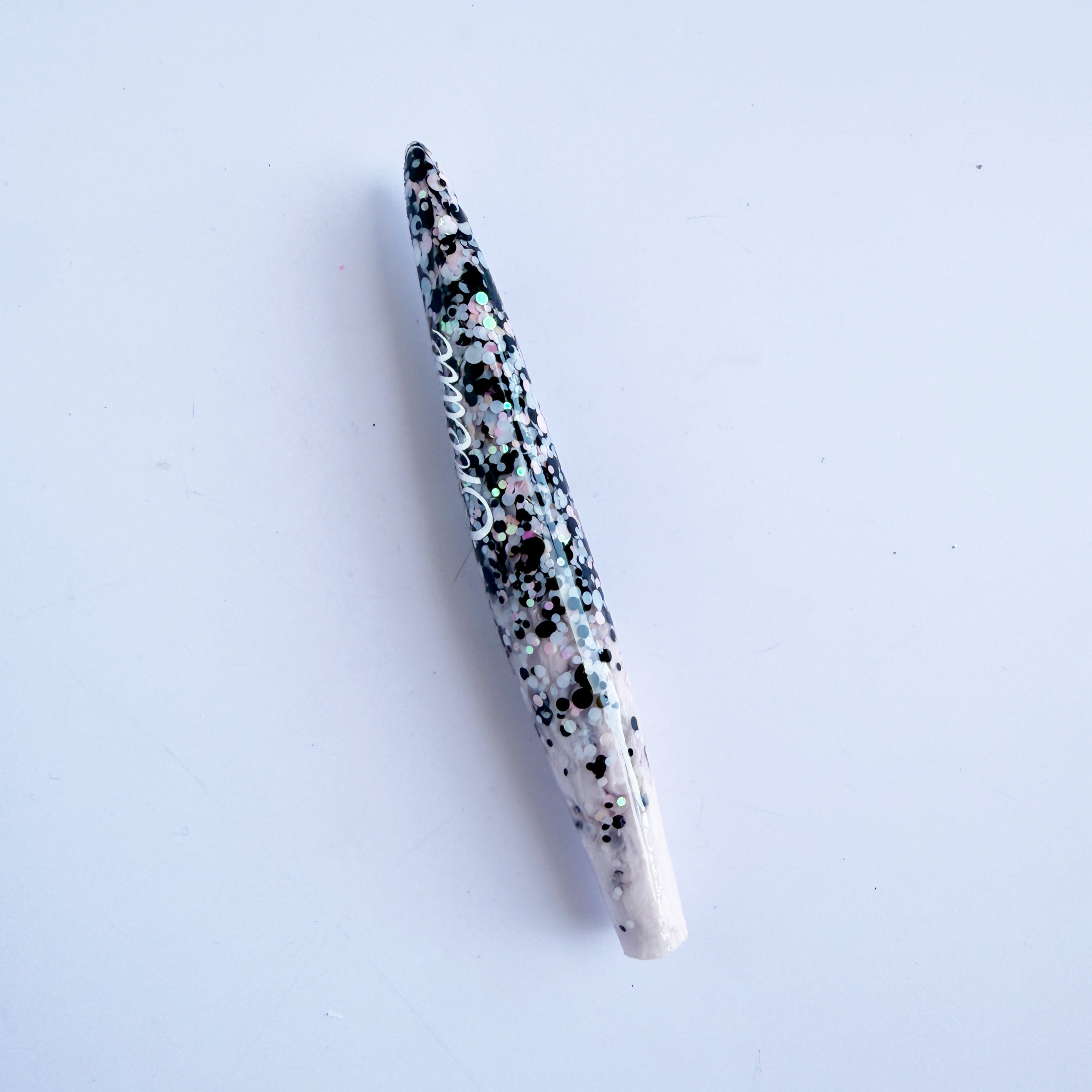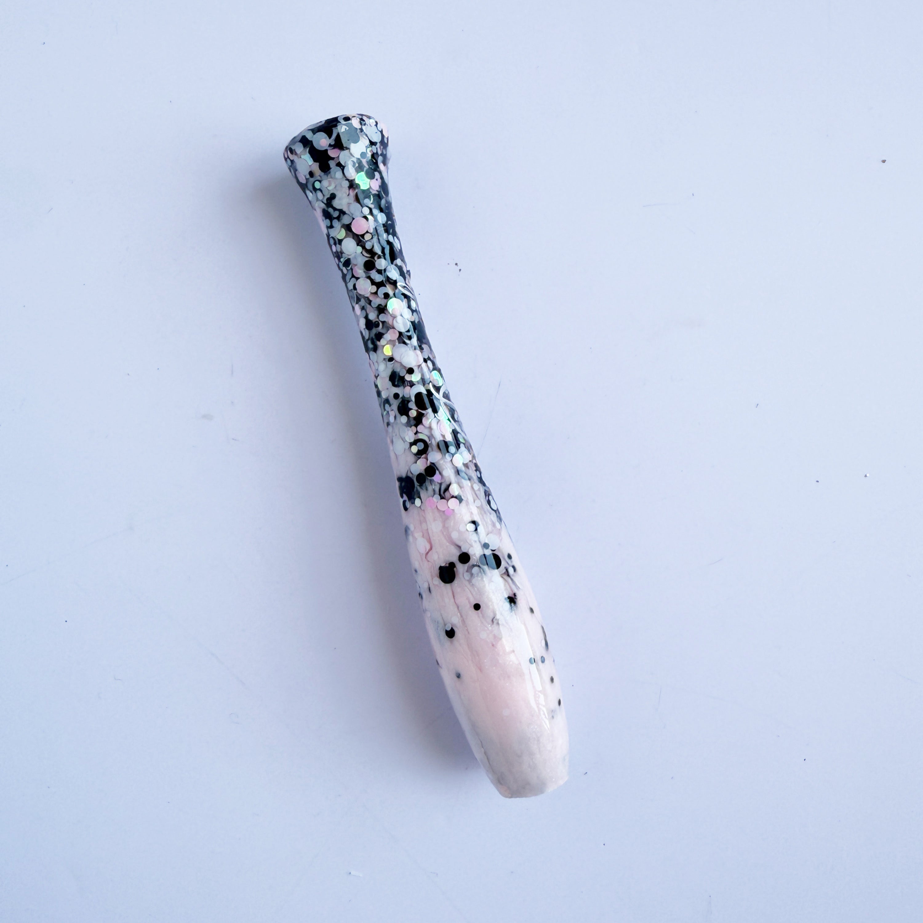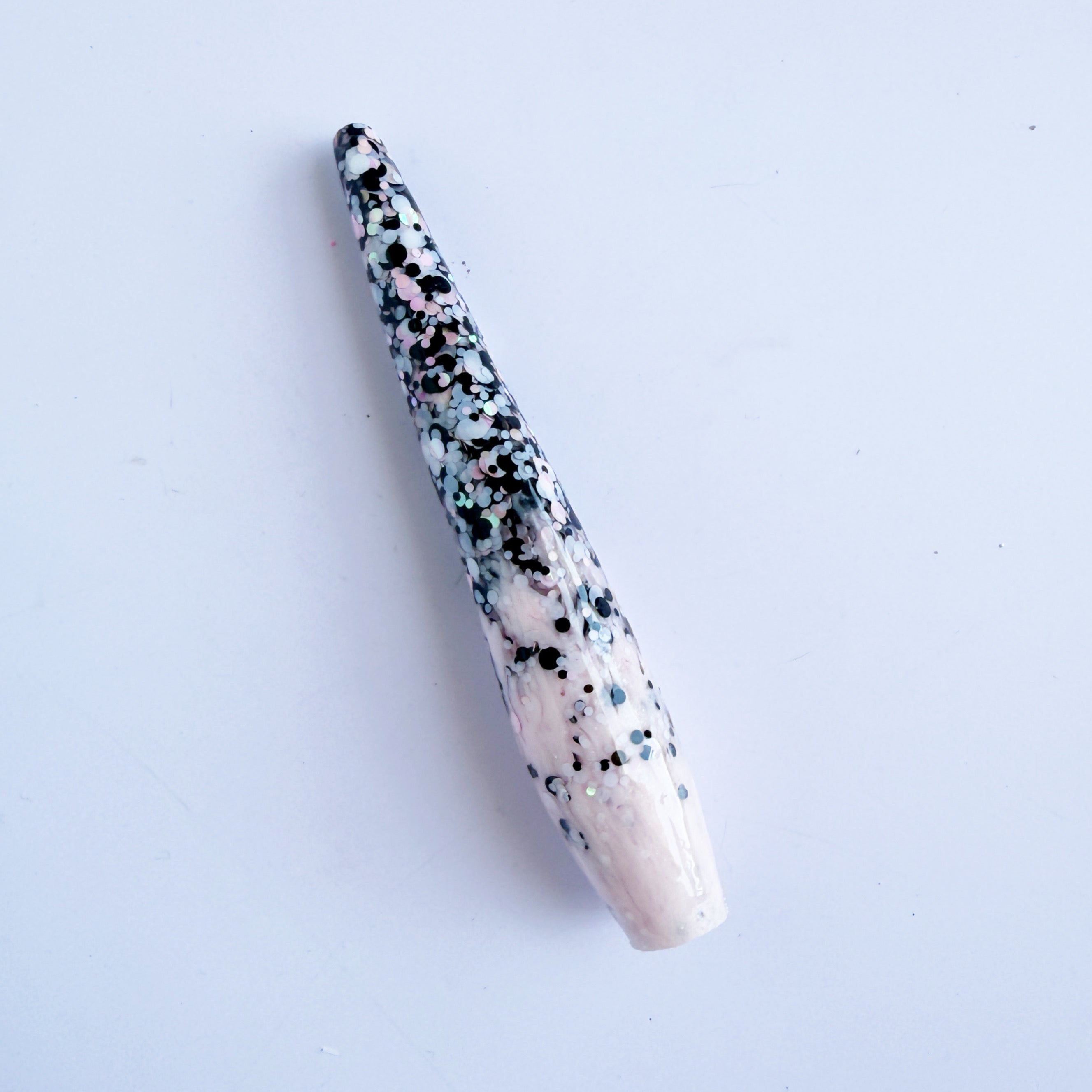'Dottie Darlin' A dotty black, white and baby pink glitter mix, fading out to a light shimmery pink resin.