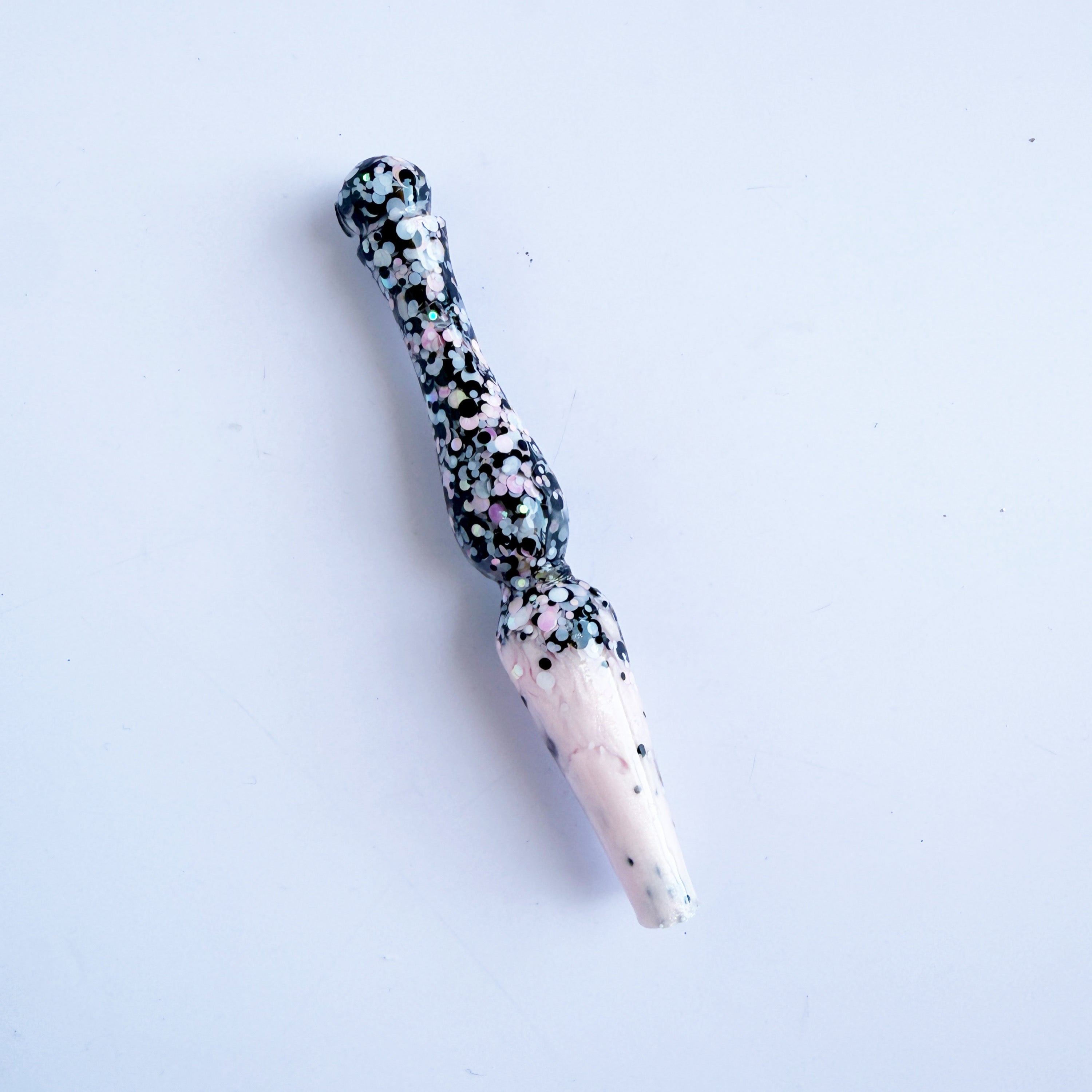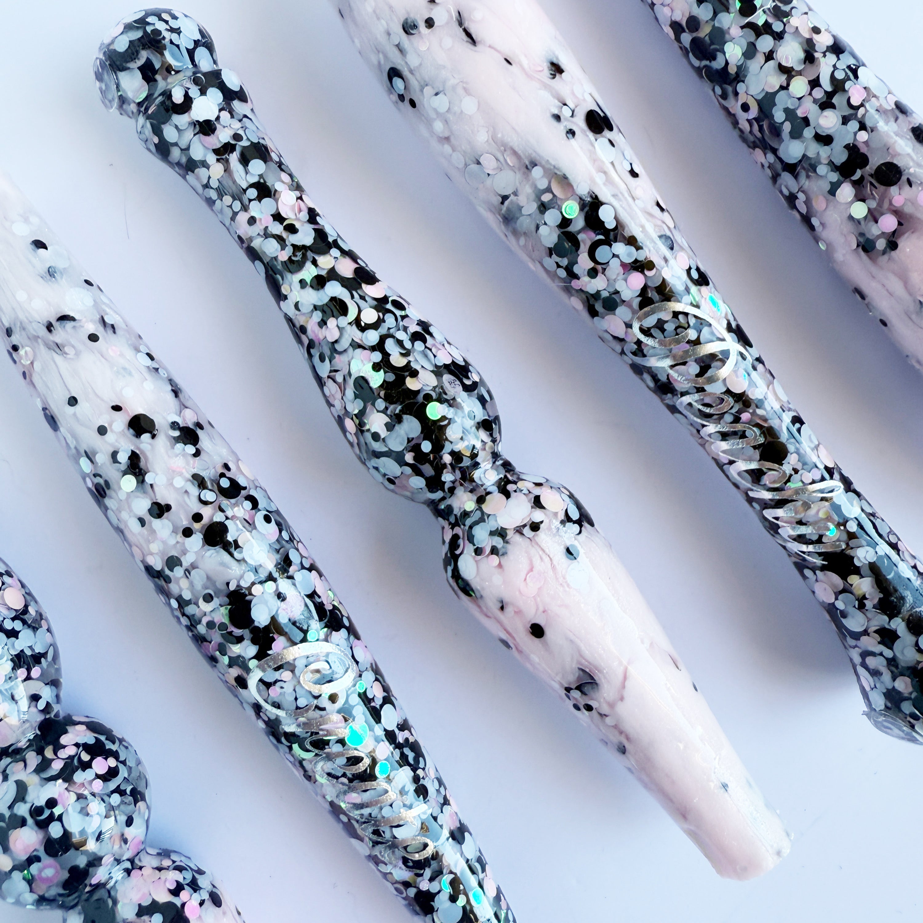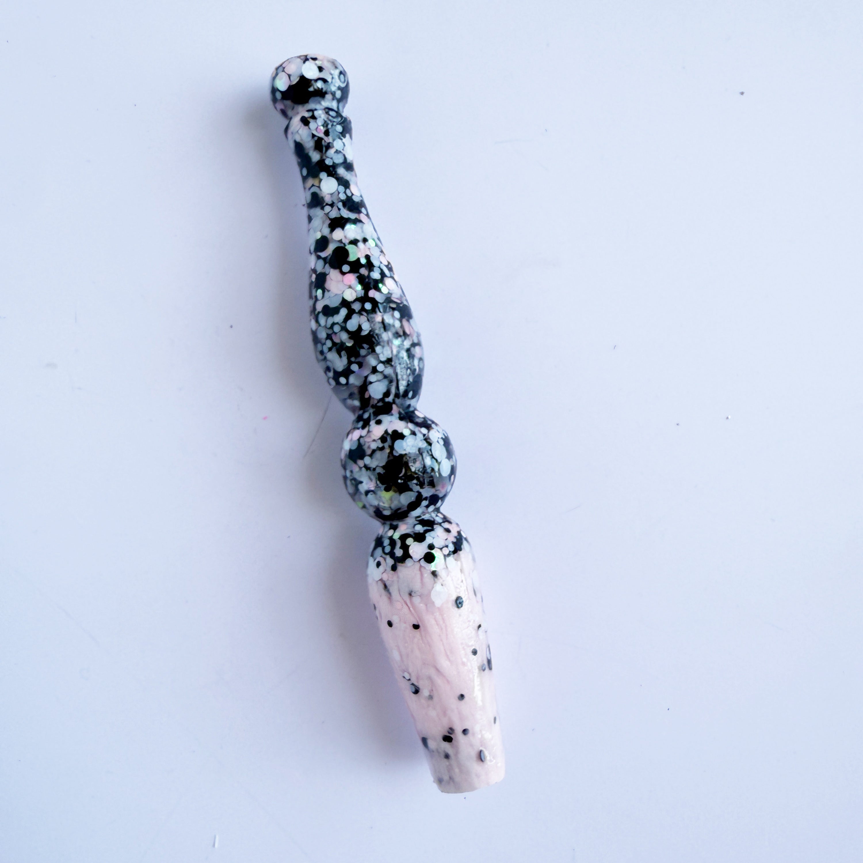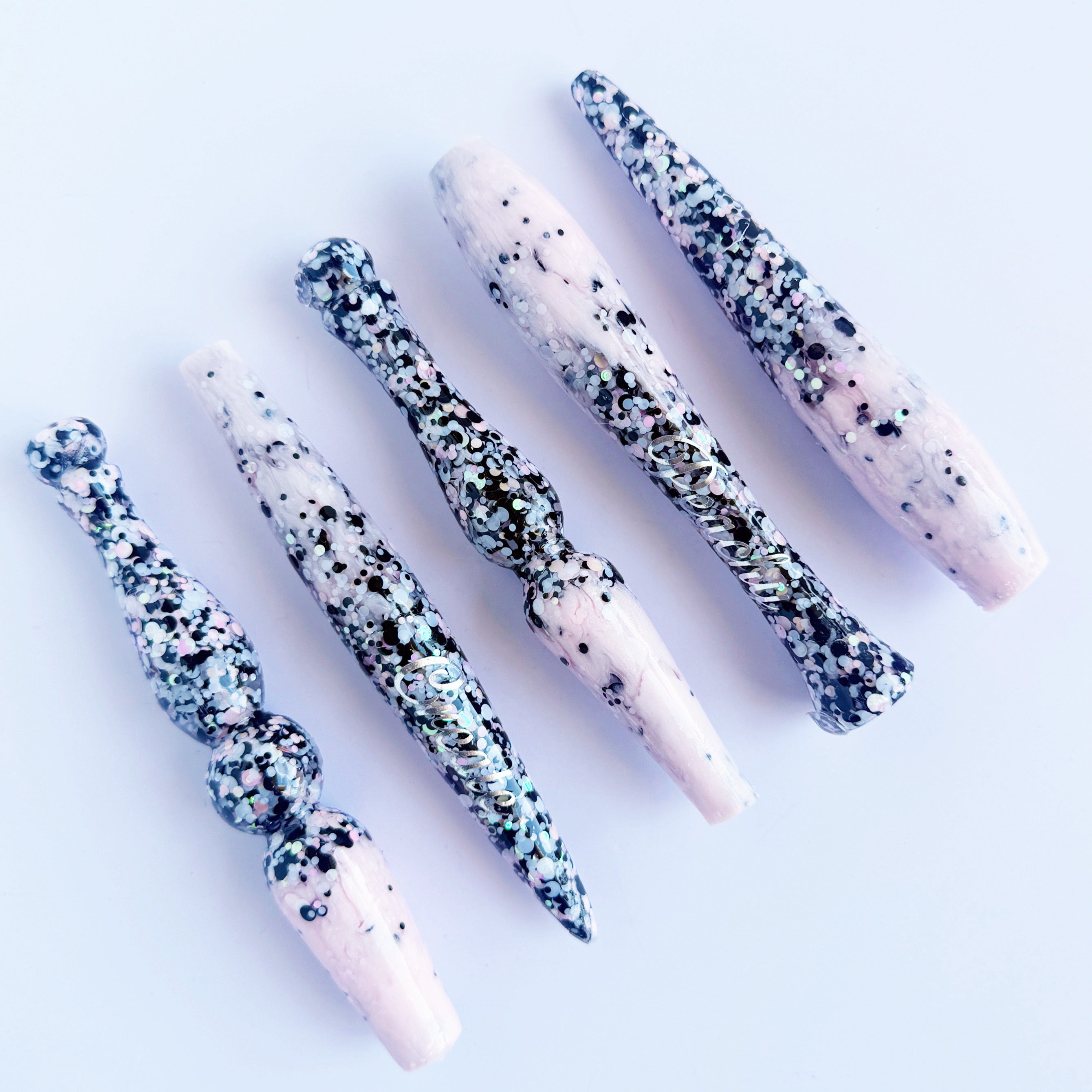 'Dottie Darlin' A dotty black, white and baby pink glitter mix, fading out to a light shimmery pink resin.