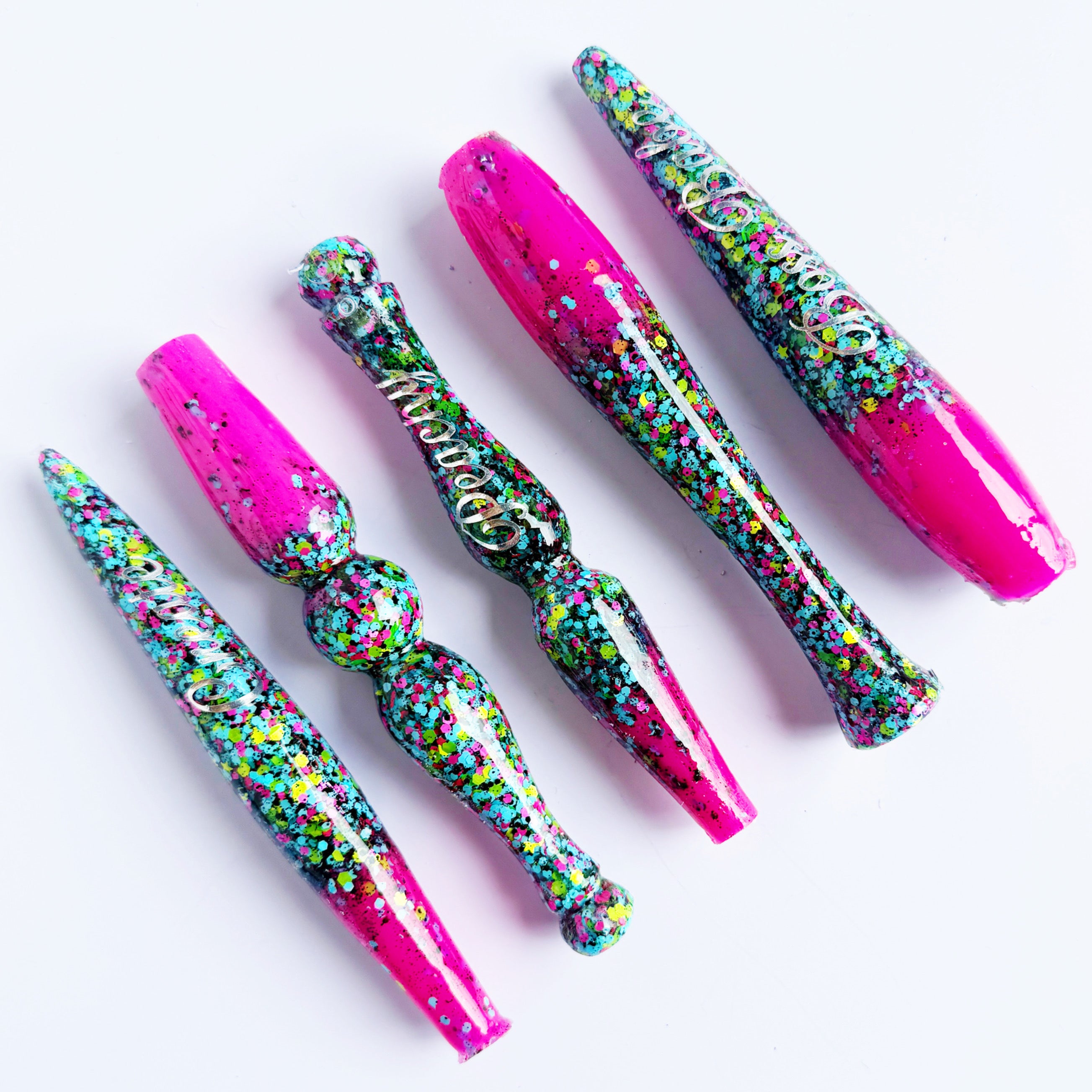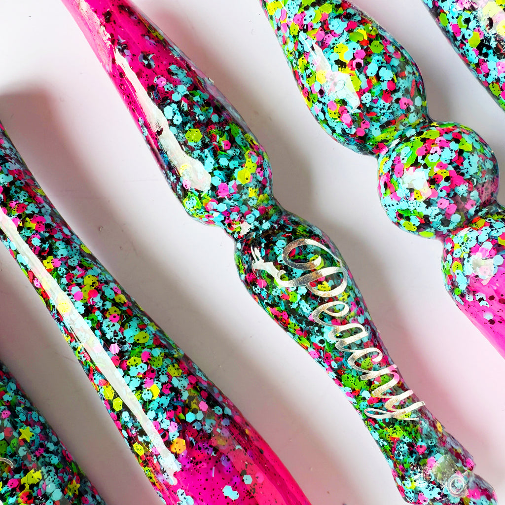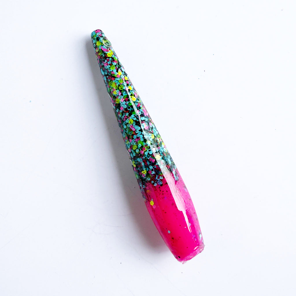 'Electric Circus' Is a Neon blue, pink, yellow and black glitter mix, which fades to a solid neon pink hue.