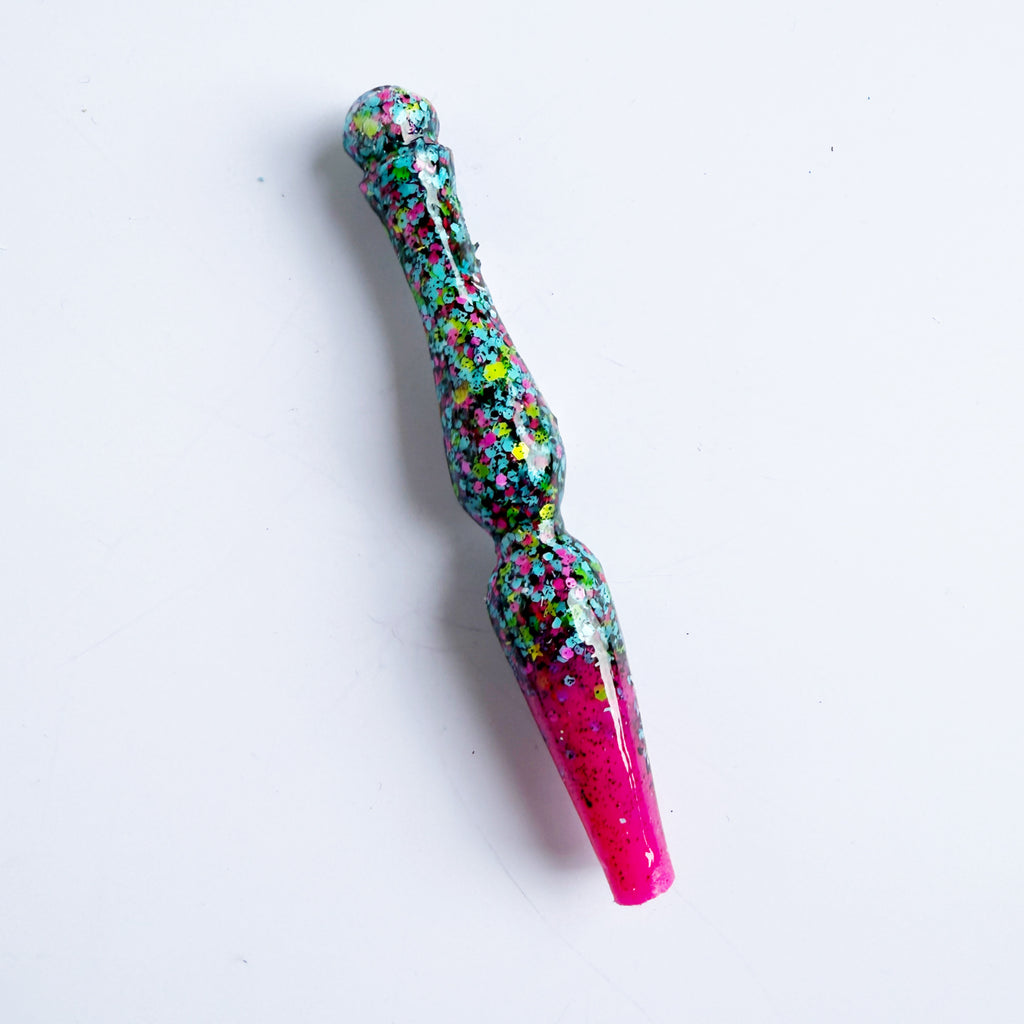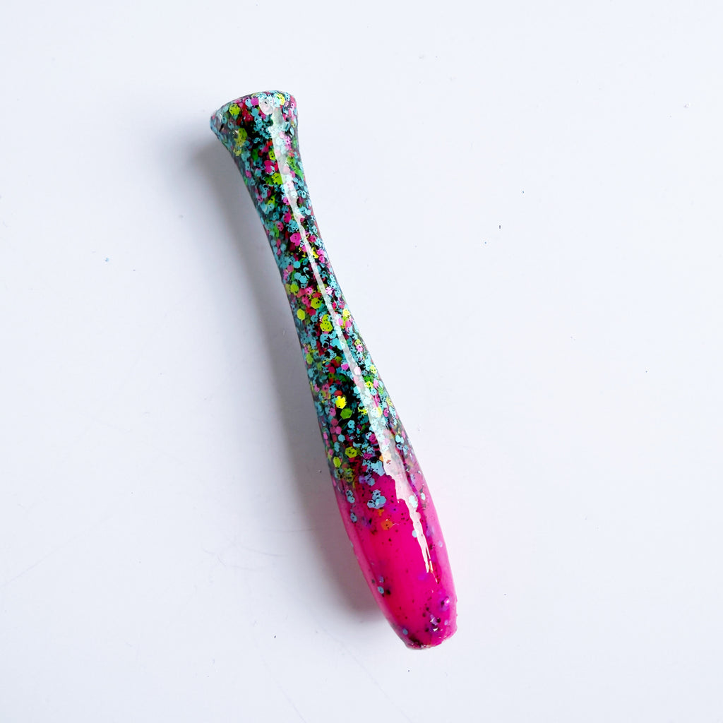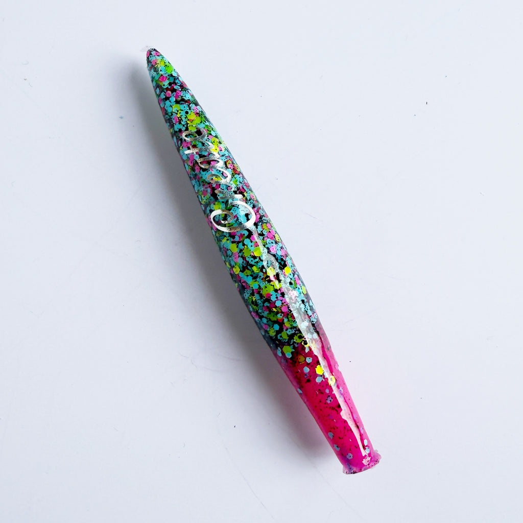 'Electric Circus' Is a Neon blue, pink, yellow and black glitter mix, which fades to a solid neon pink hue.