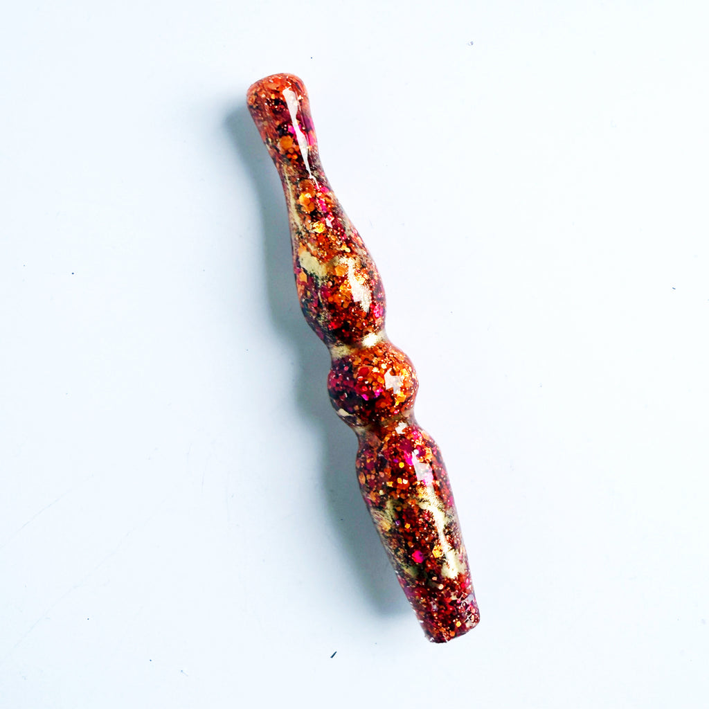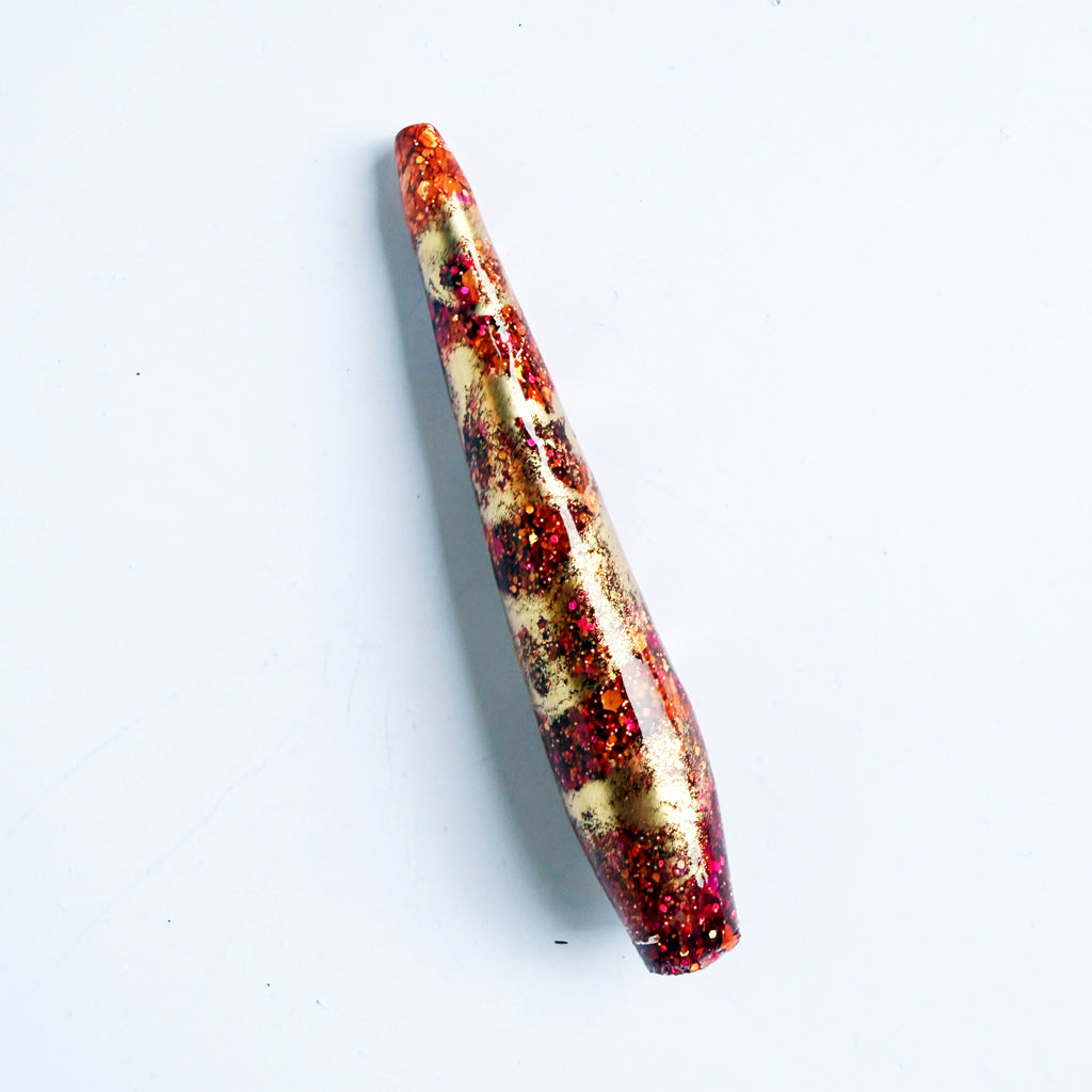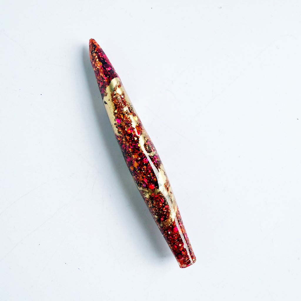 'Firestarter' Is a magenta red and orange chunky glitter mix, with a gold ink overlay.