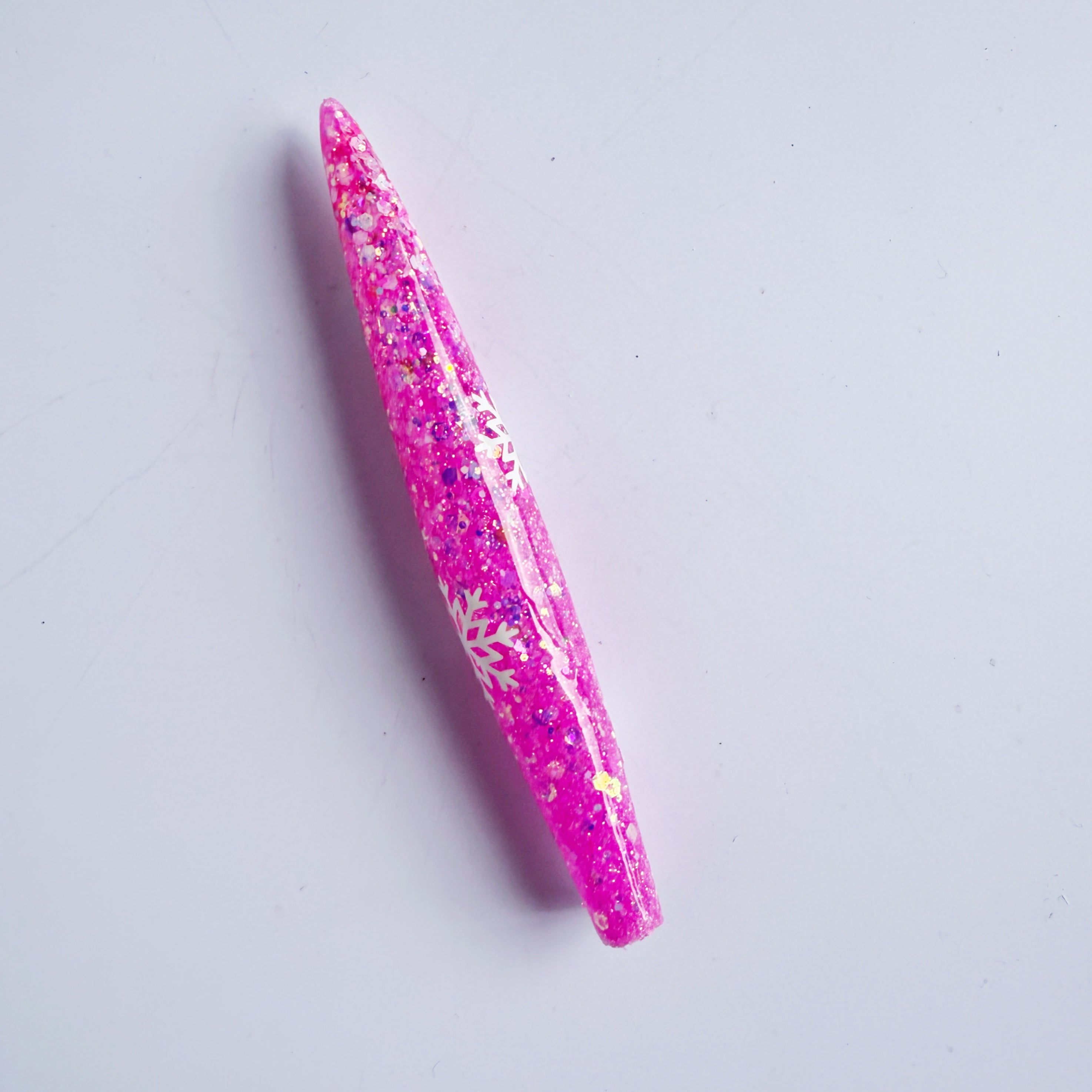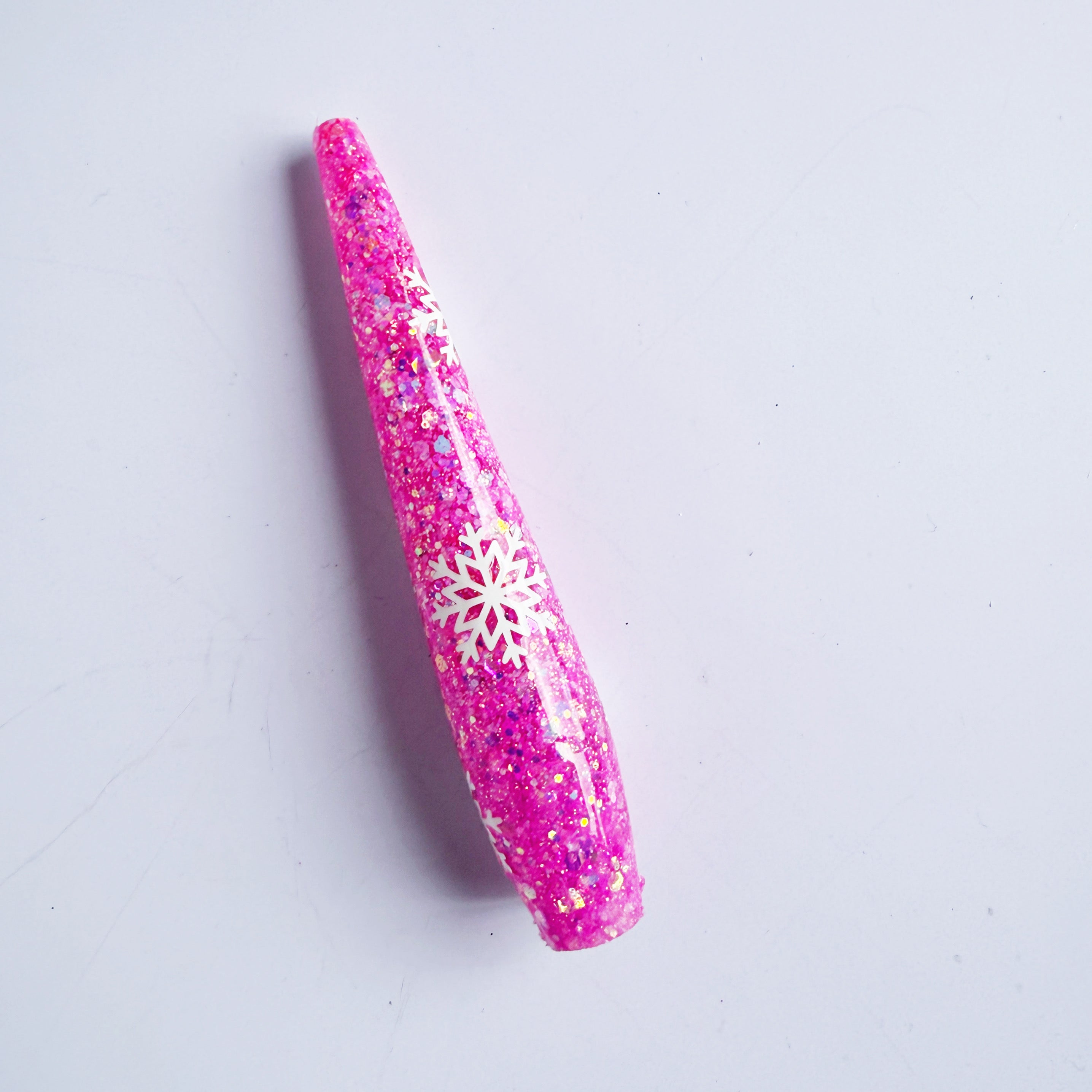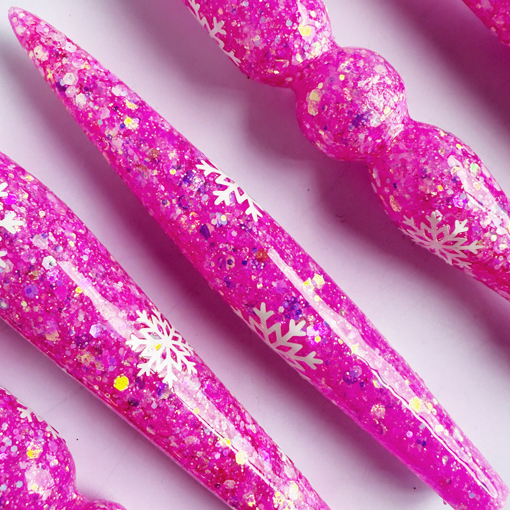 'Holiday Hottie' Is a stunning hot pink glitter base with white snoeflake decals.