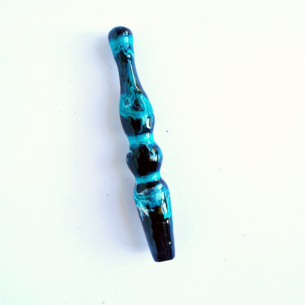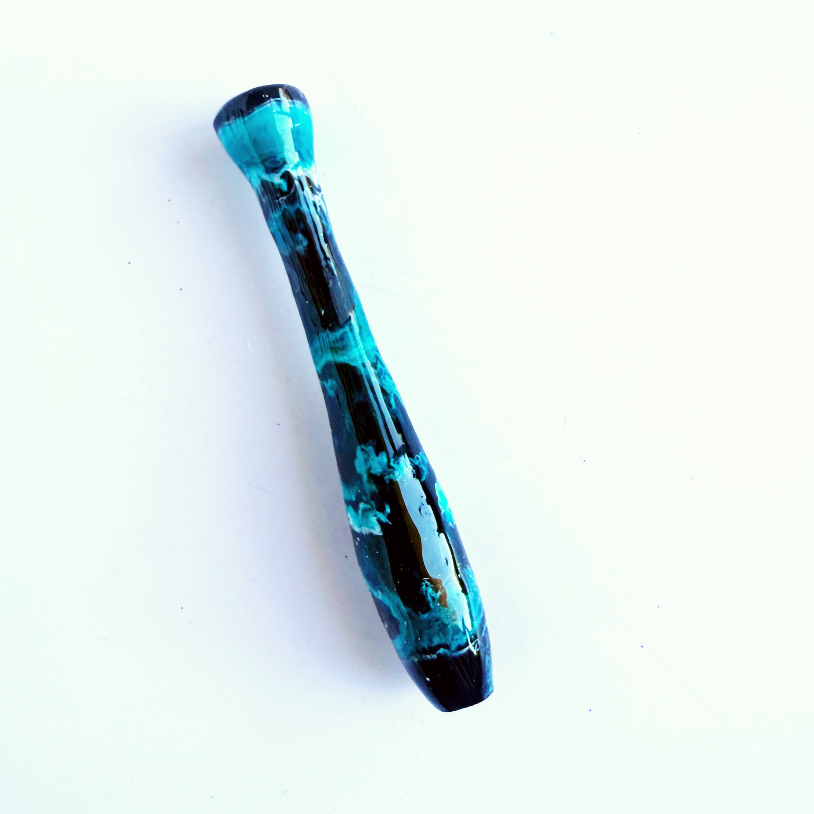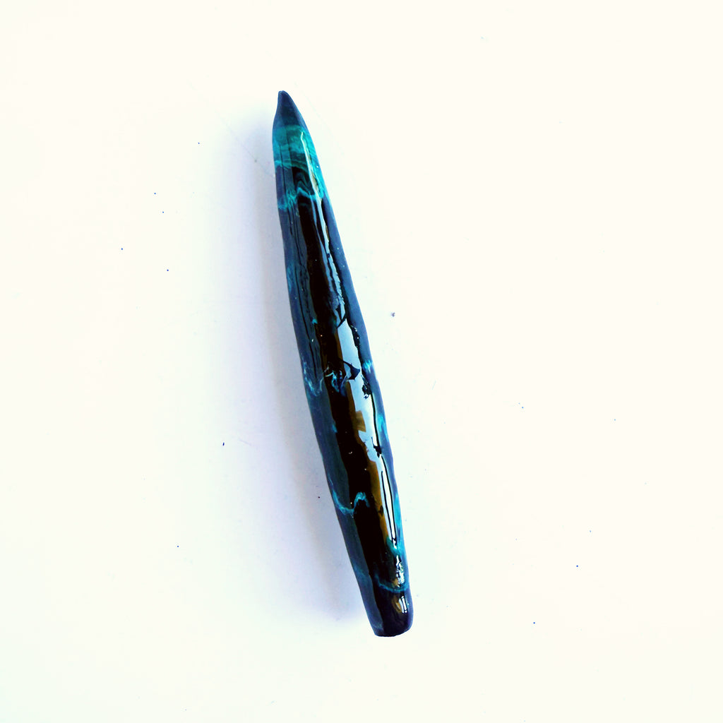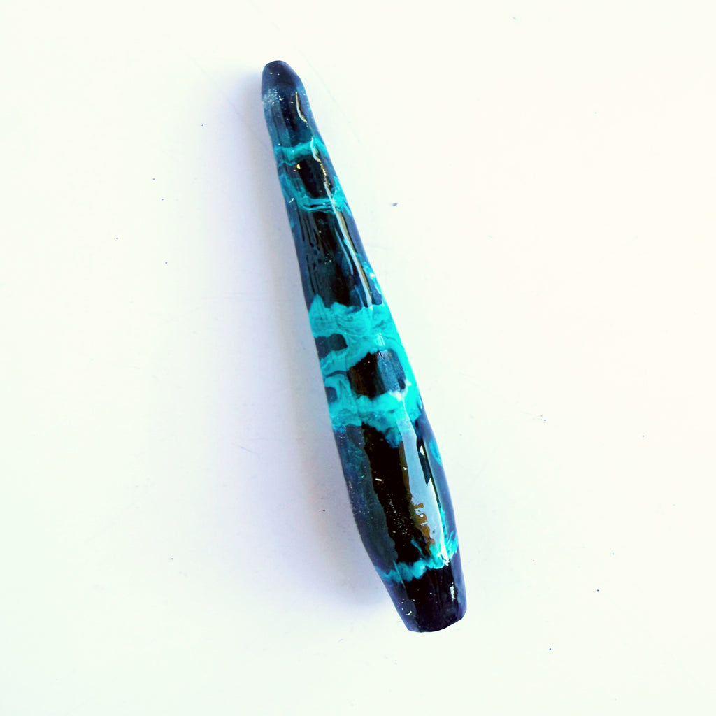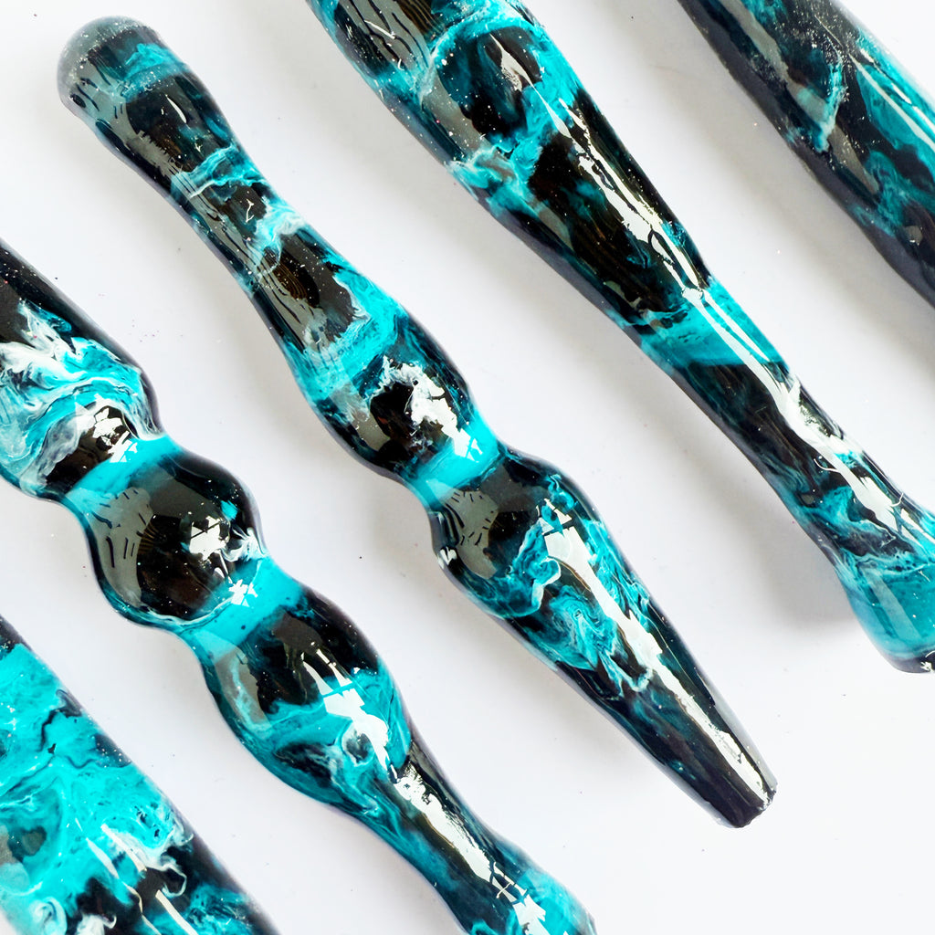 'Obsidian Current' Is a solid black handle with swirls of bright electric teal ink overlaid.