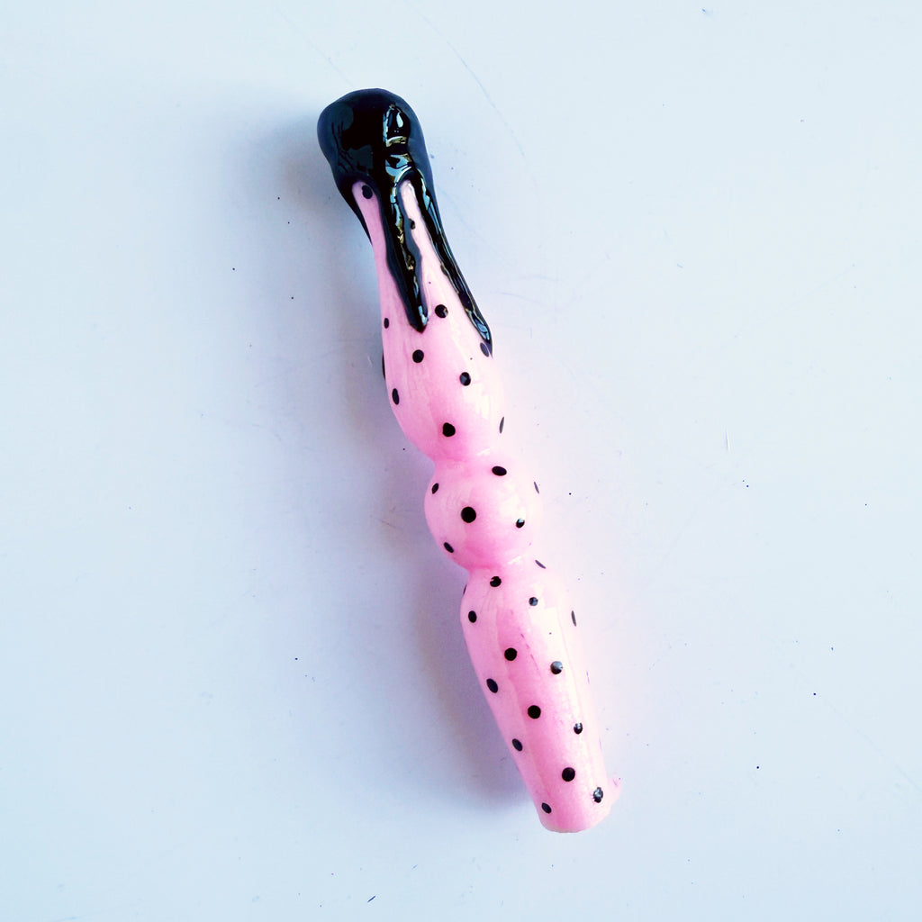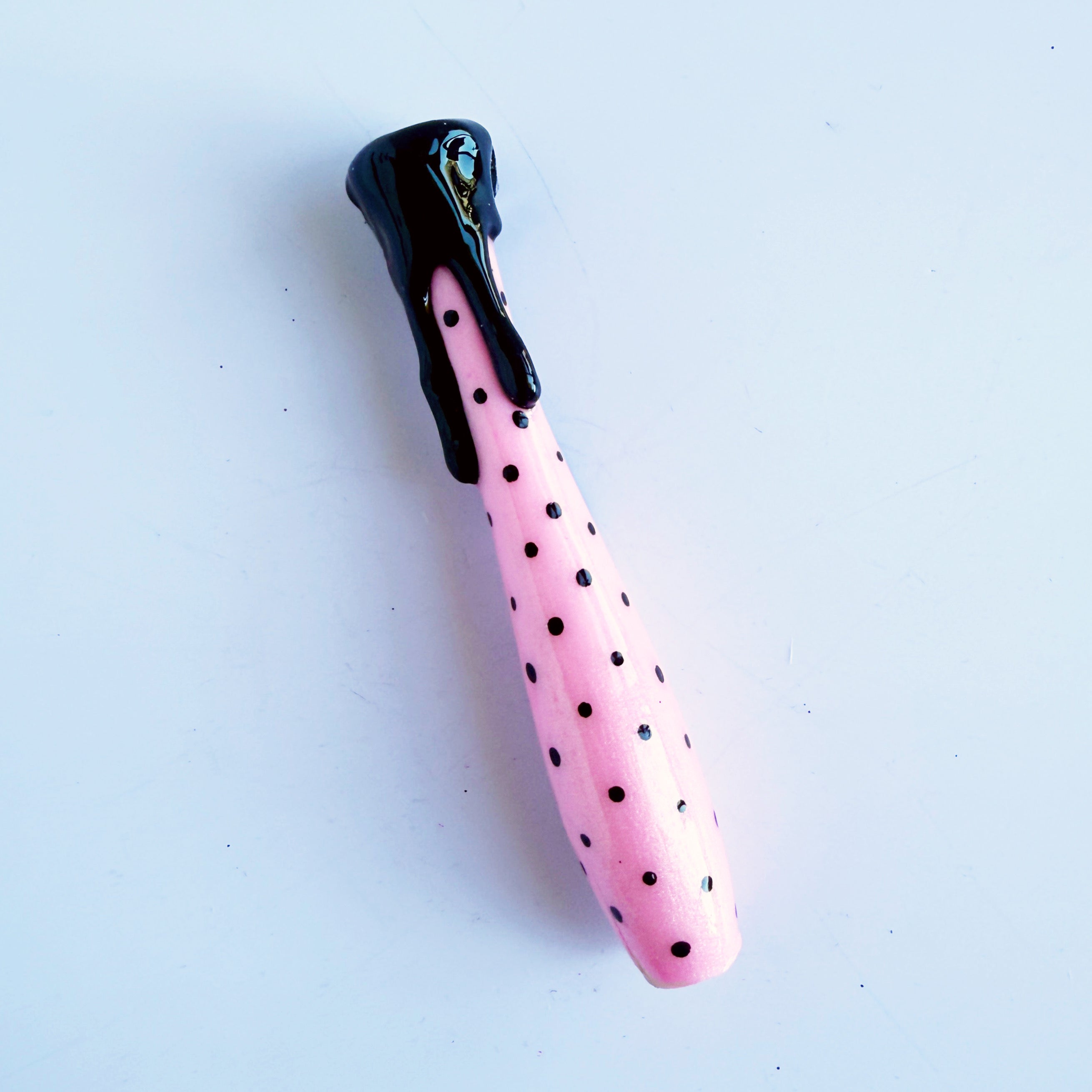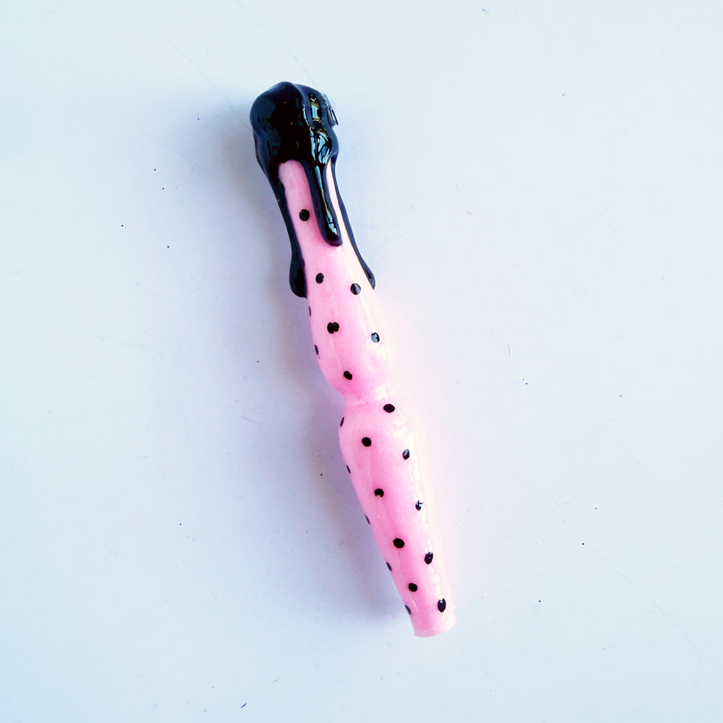 'Rockabella Babe' Is a shimmery baby pink handle, with painted black pokadots and a black resin drip finish.