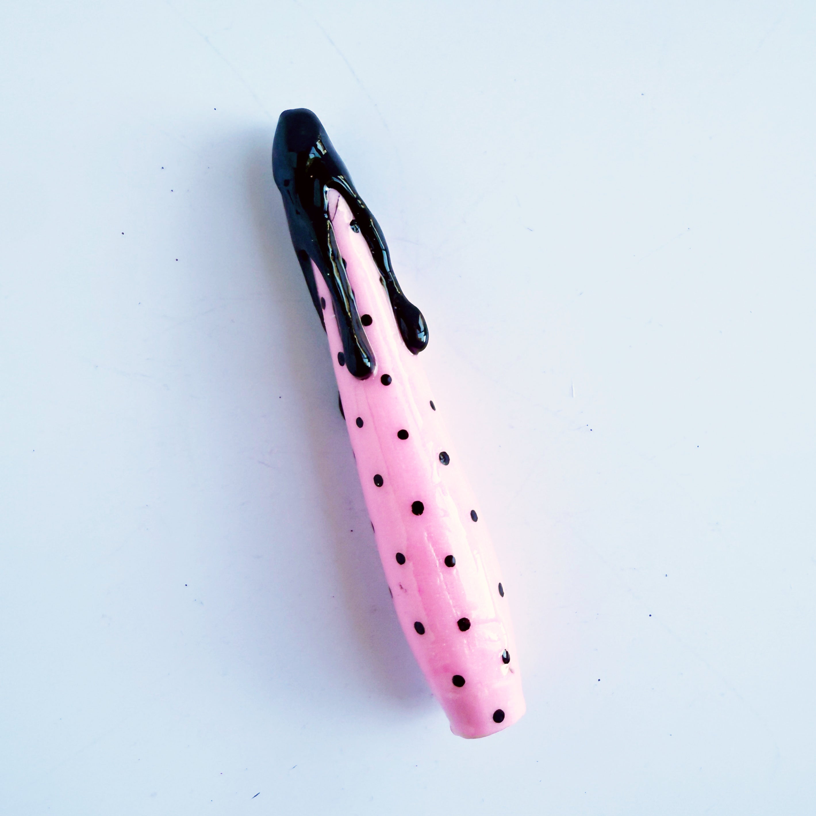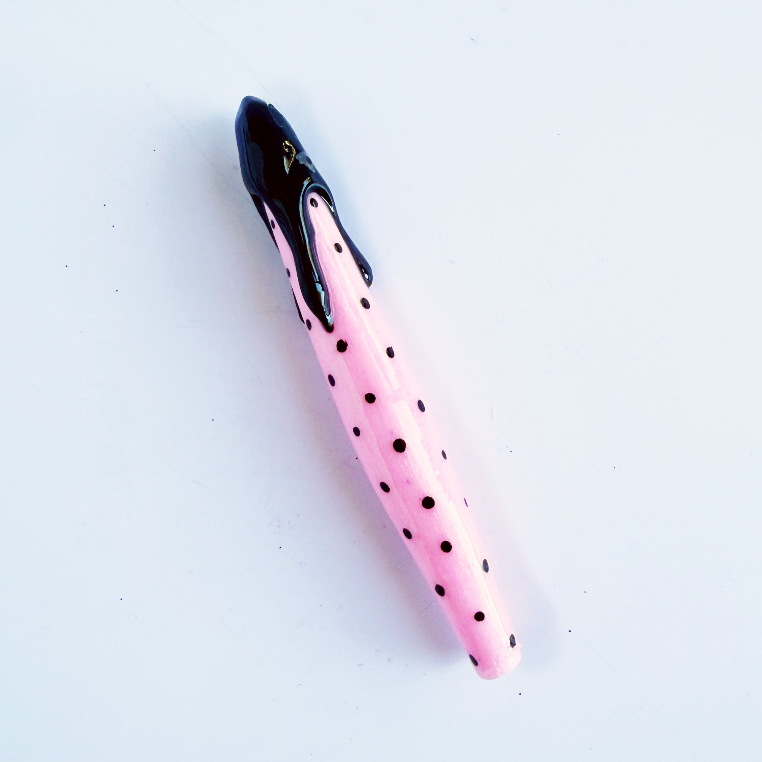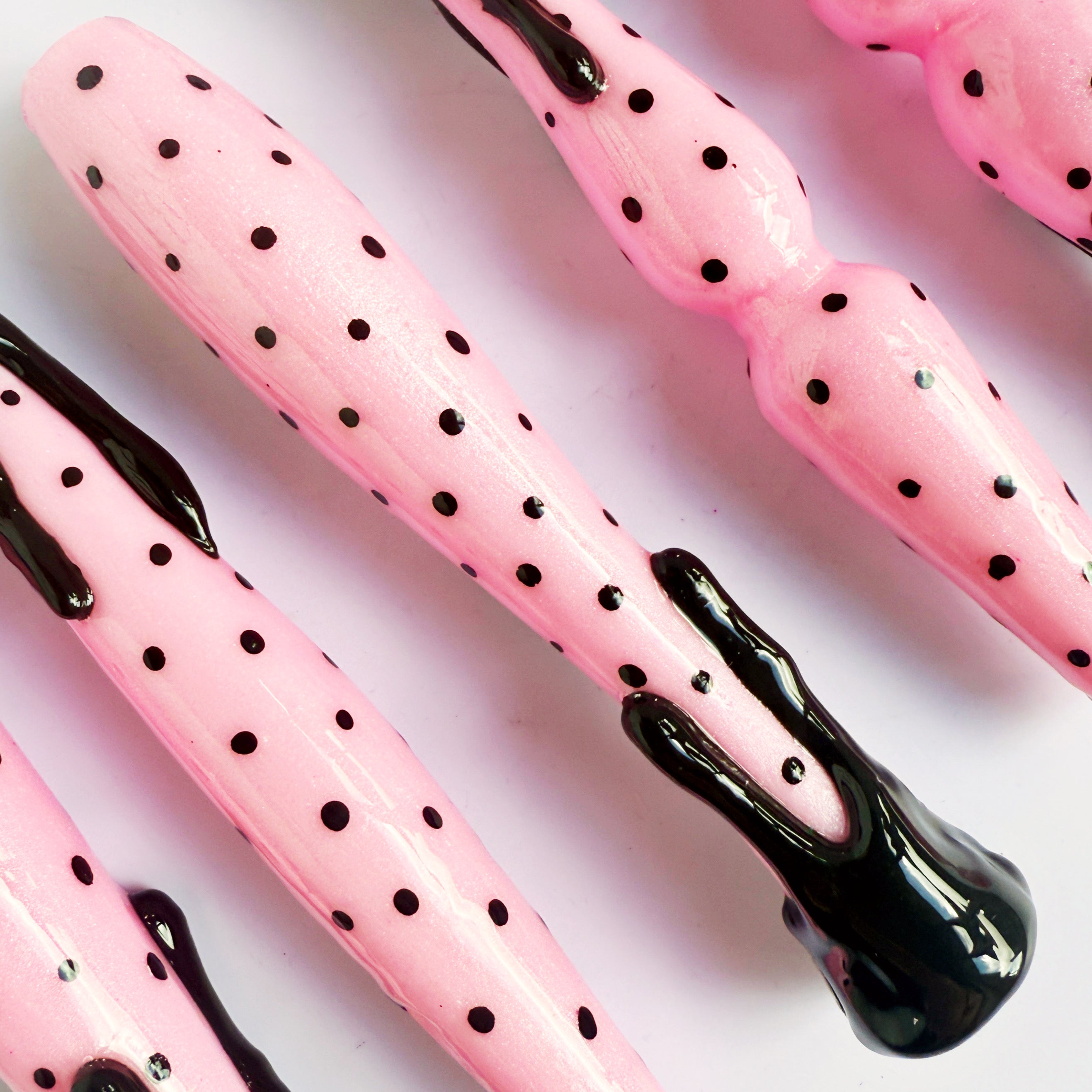 'Rockabella Babe' Is a shimmery baby pink handle, with painted black pokadots and a black resin drip finish.