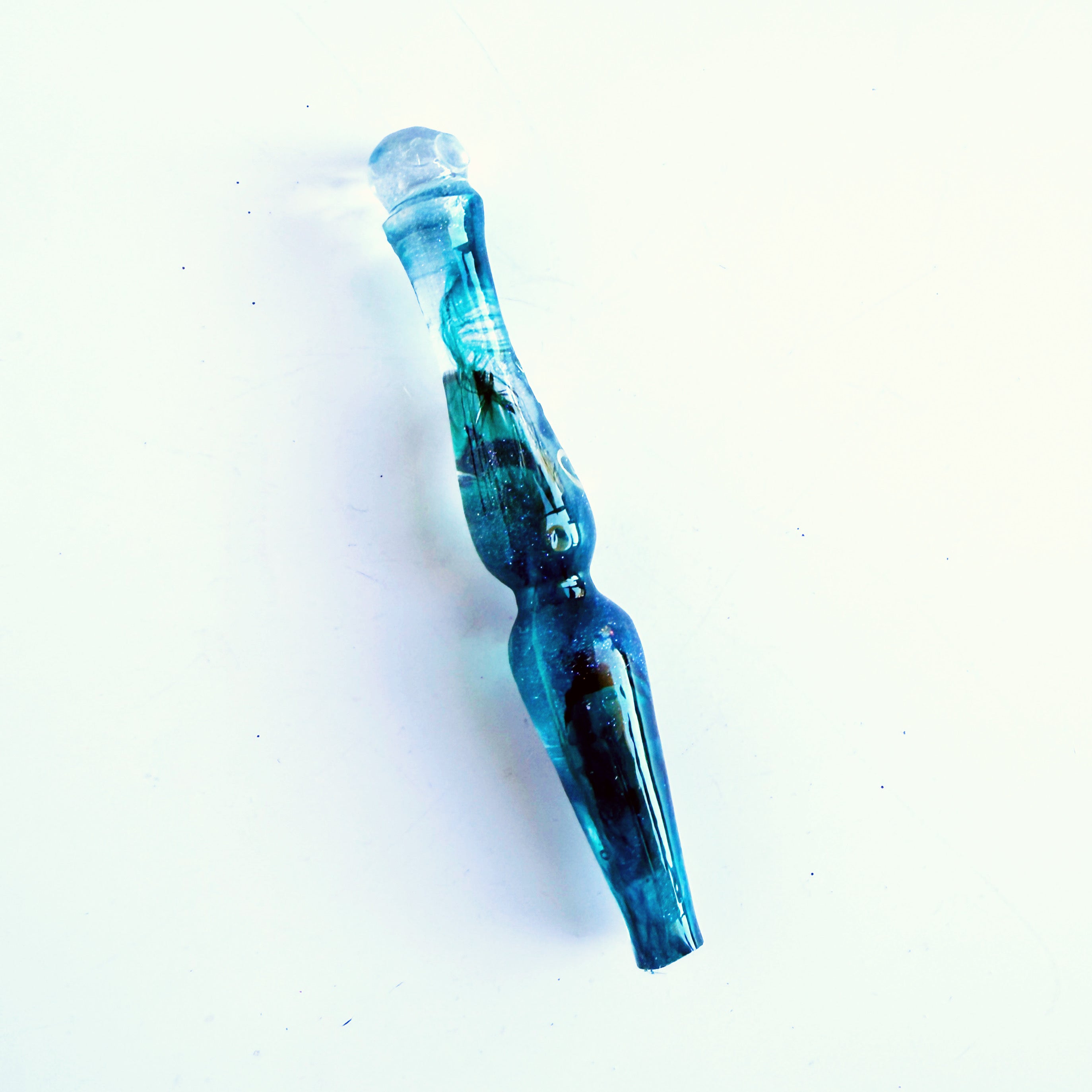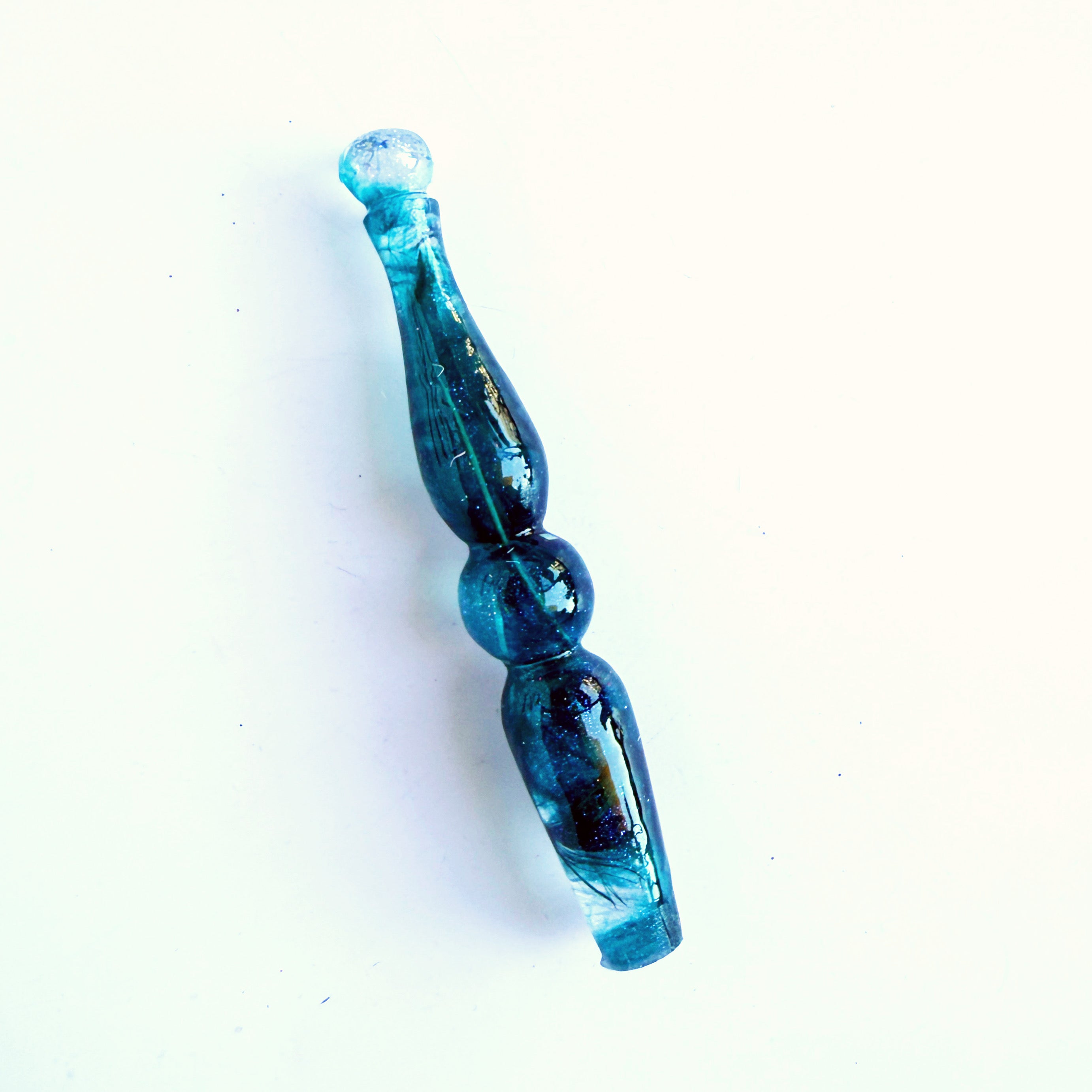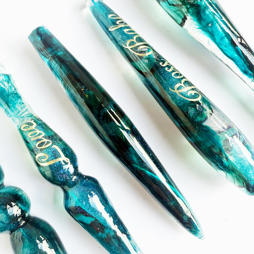 'Stormbird' Is a clear handle with a slight blue shimmer and filled with teal and black feathers.