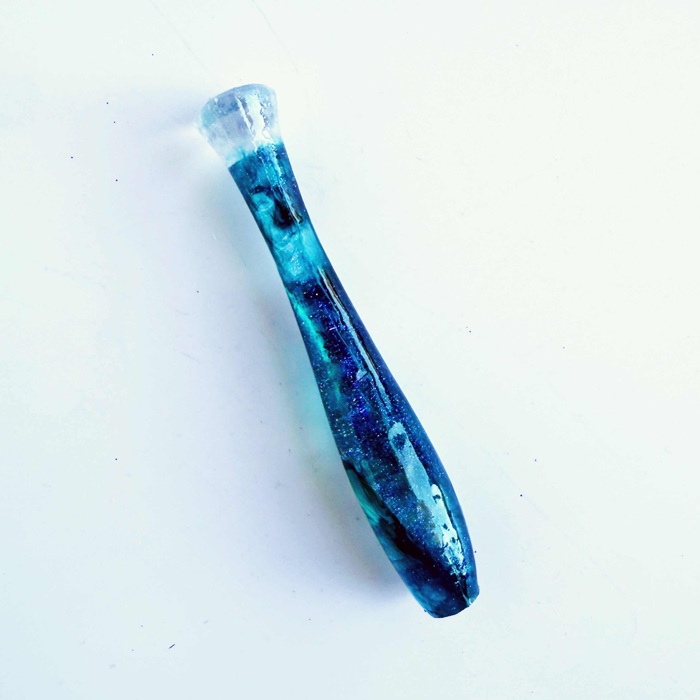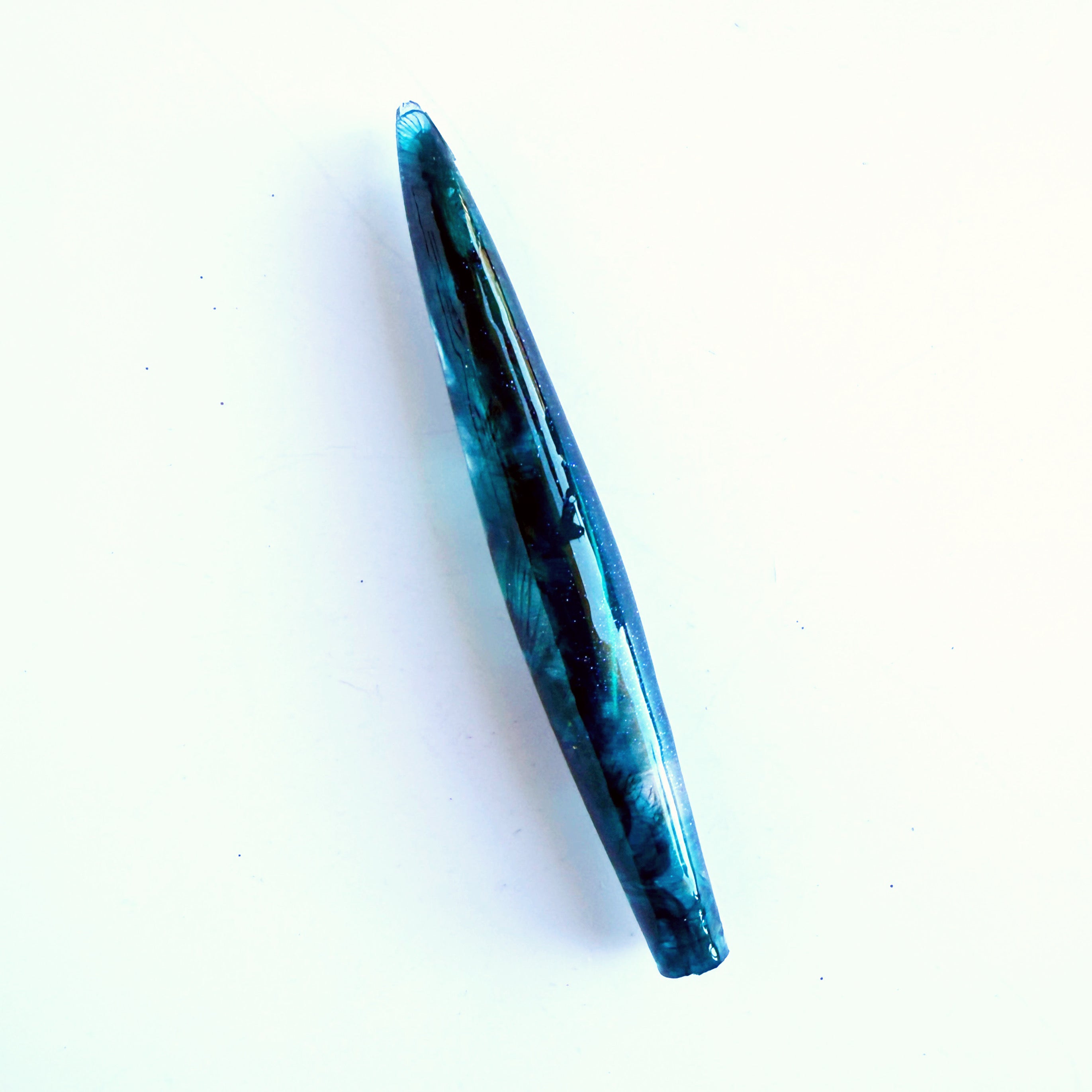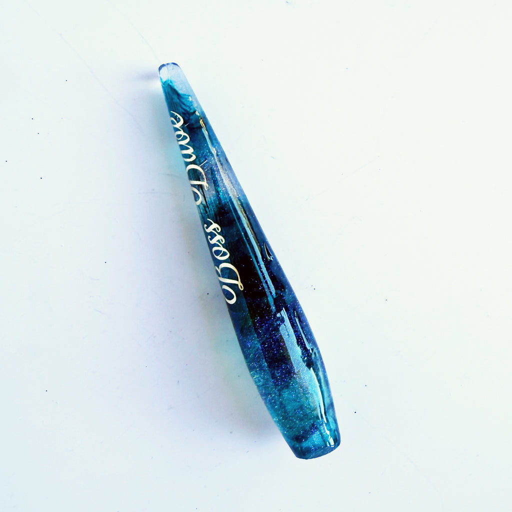 'Stormbird' Is a clear handle with a slight blue shimmer and filled with teal and black feathers.