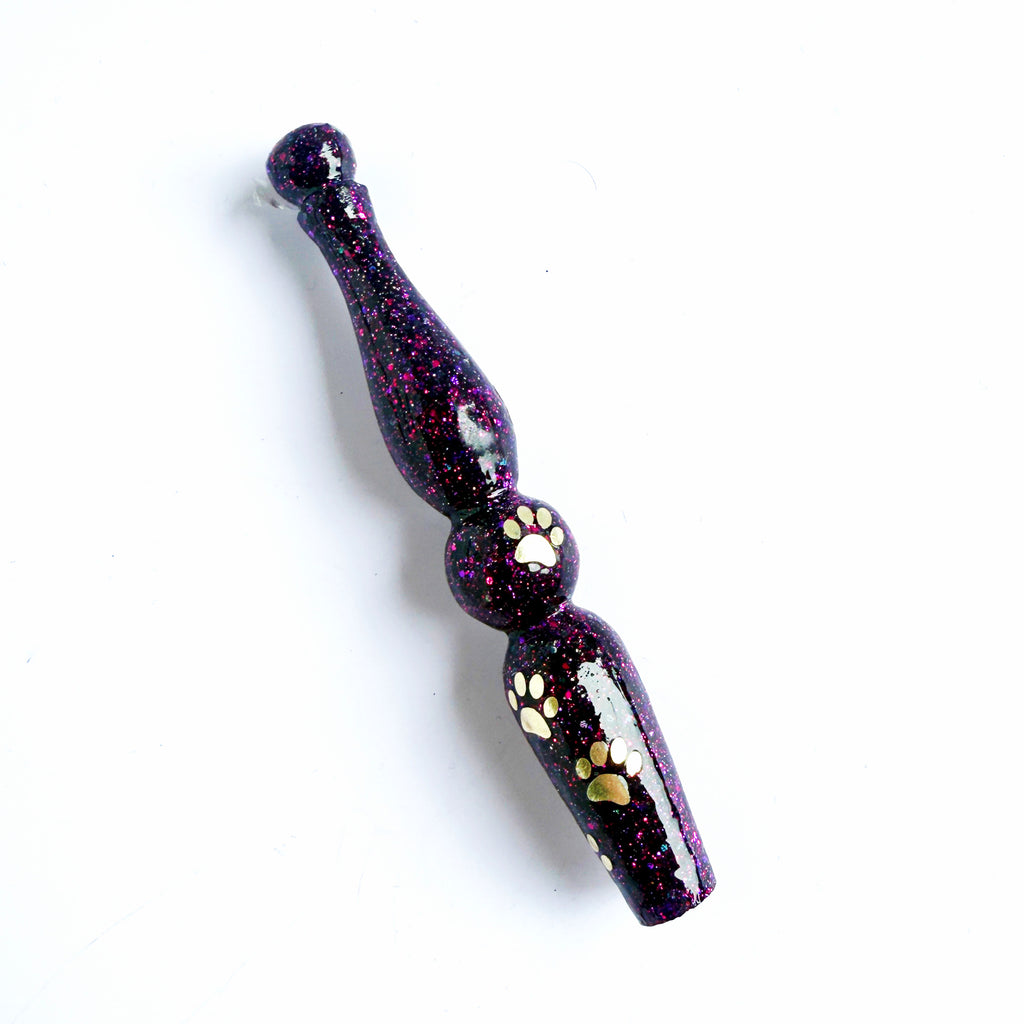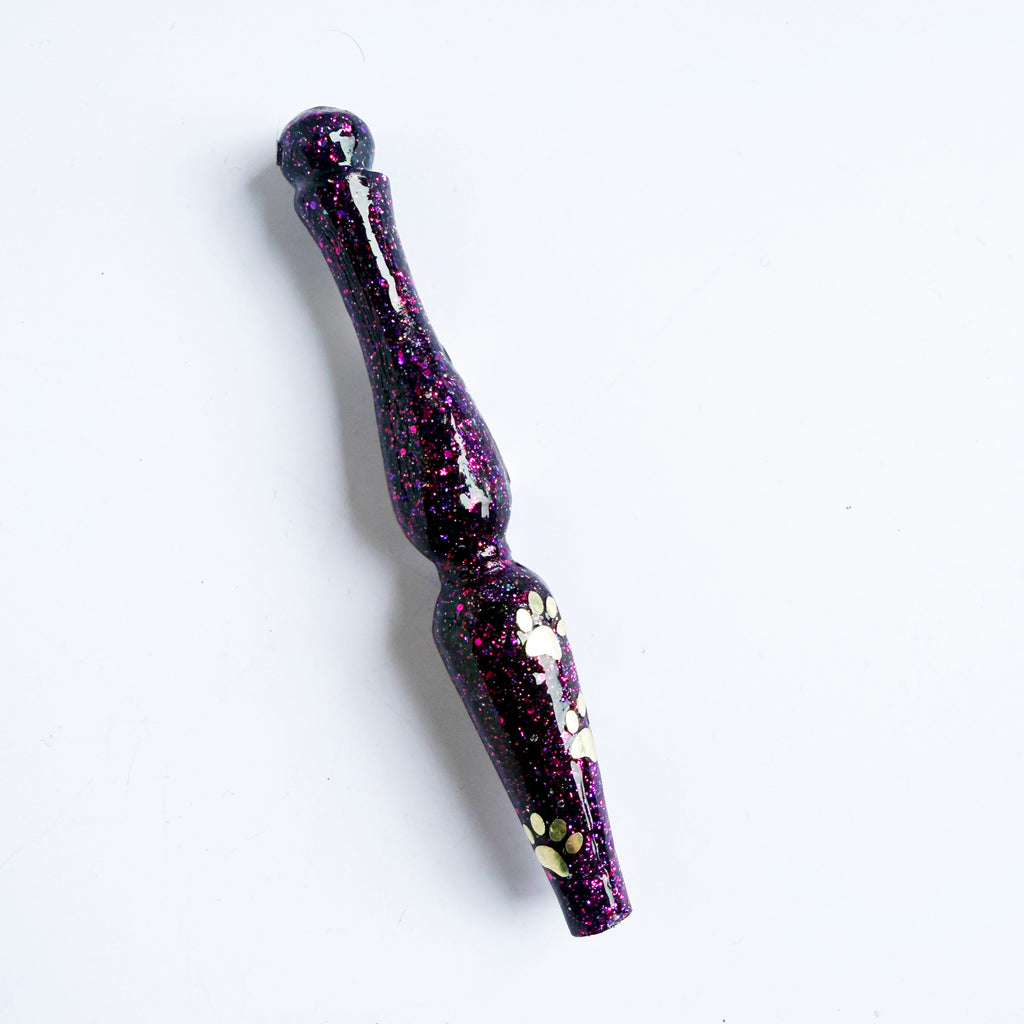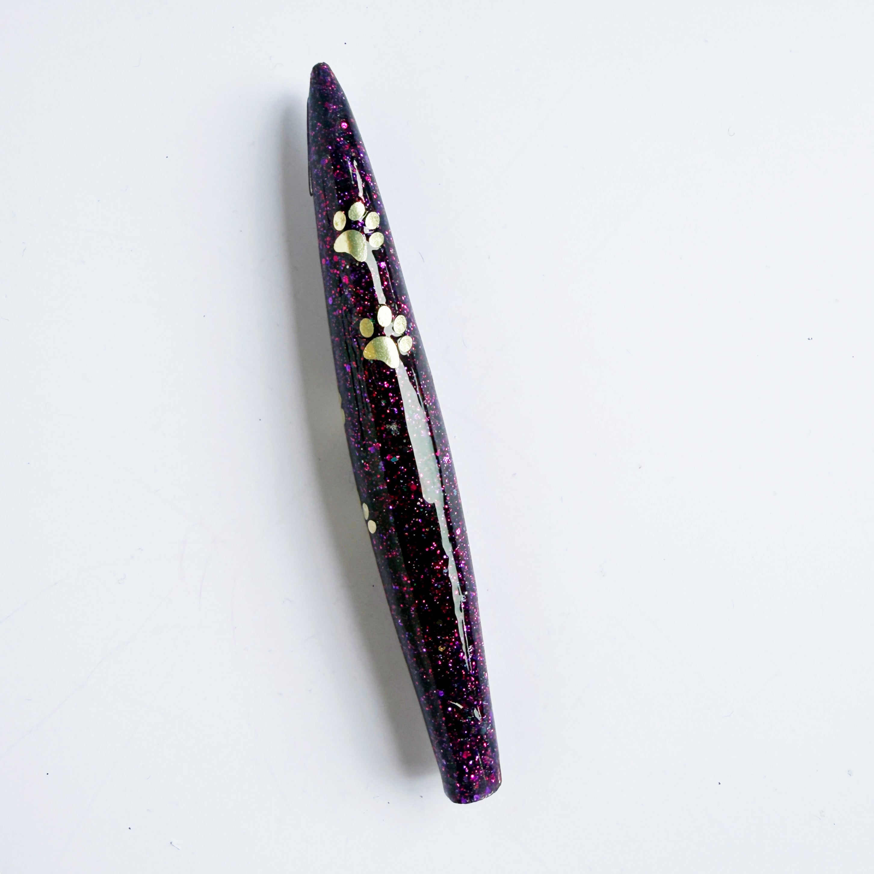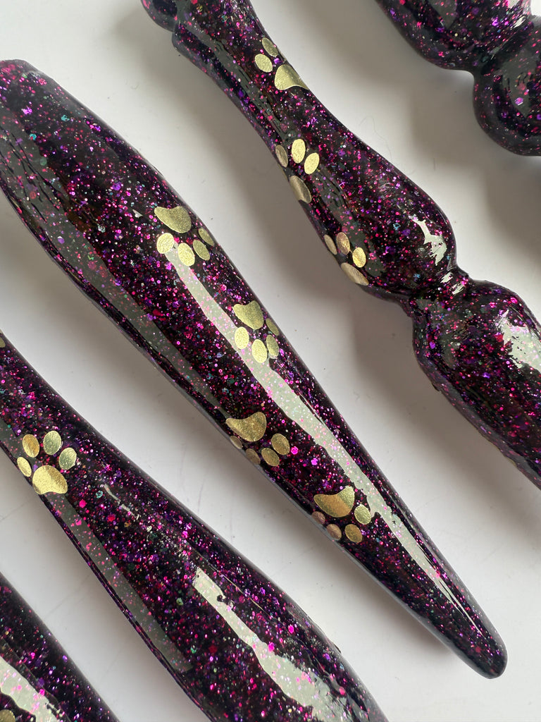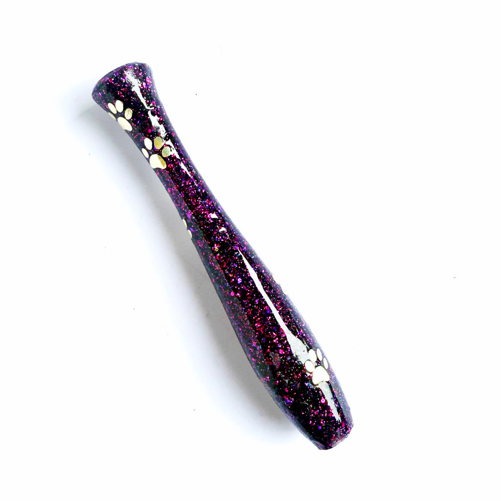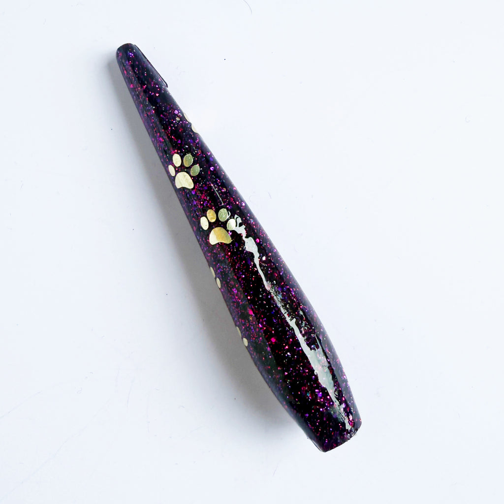 'Violet Pawse' Is a fine purple glitter base with pink reflections. Added is a swirl of gold vinyl pawprints.